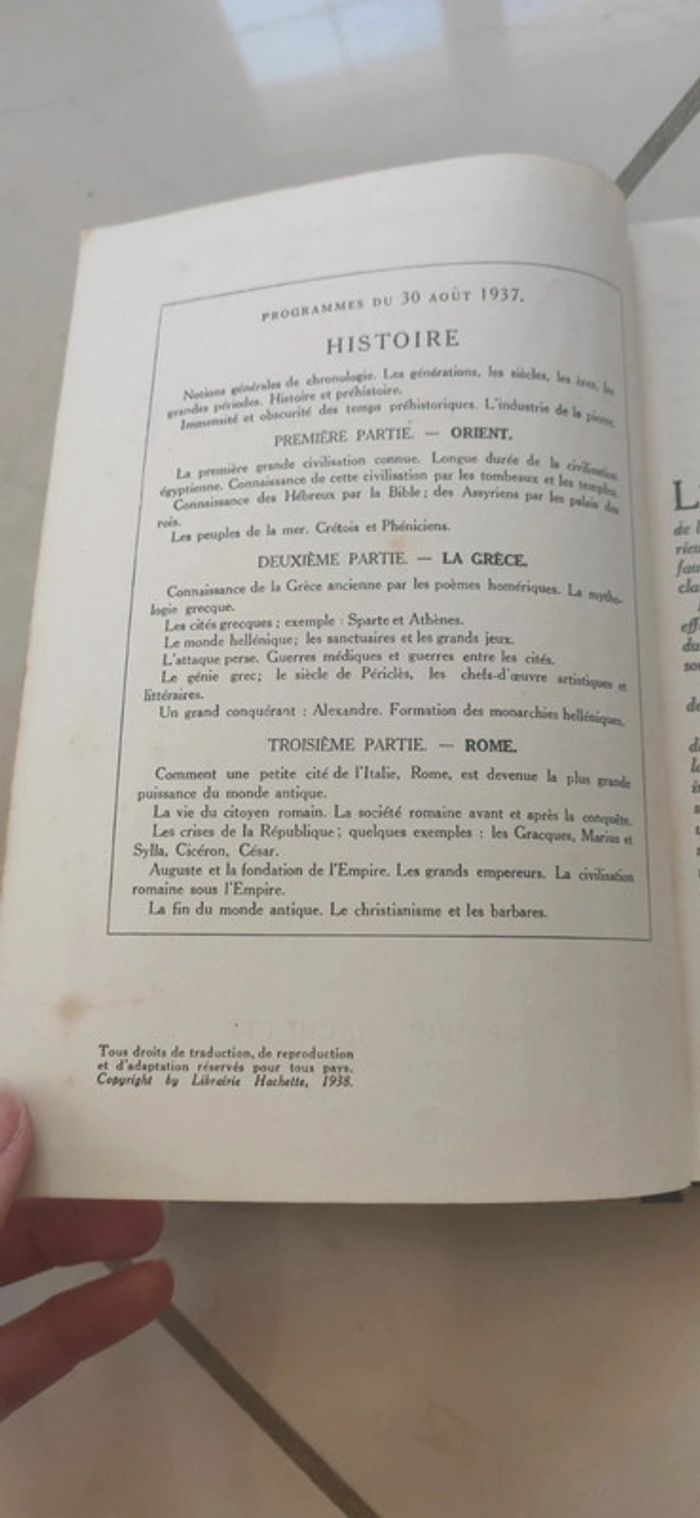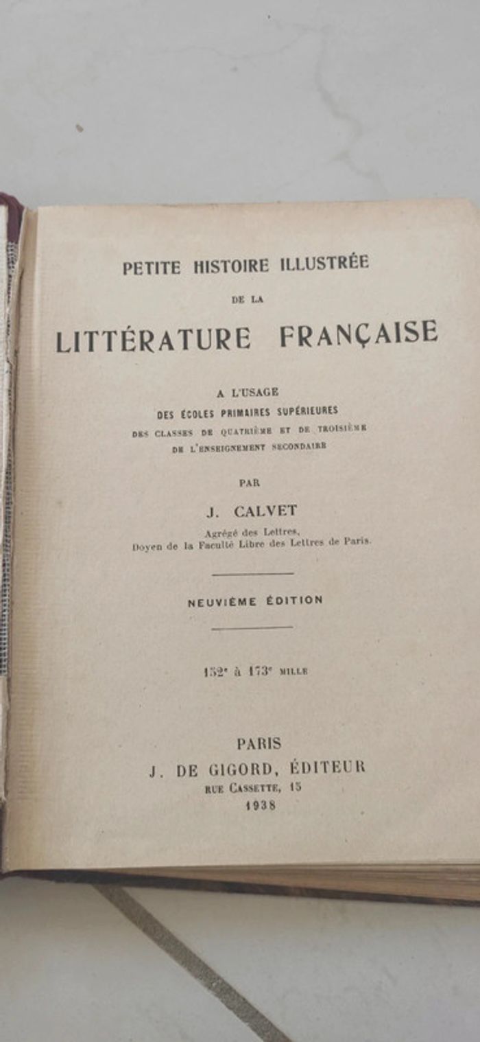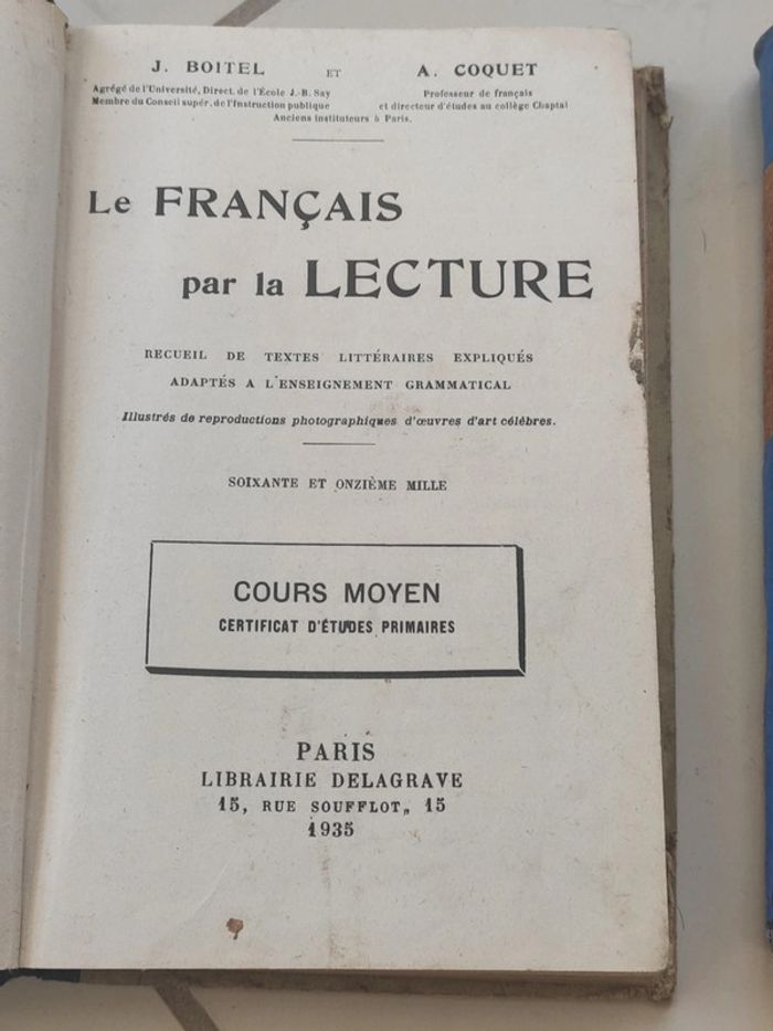 Lot de livres anciens, à prendre en l'état. Idéal collectionneur, certains sont rare: - Le français par la lecture - Leçon de langue française - Histoire de France cours moyen 2eme année et certificat d'études - Histoire classe de 6eme - Fables choisies - Petites histoires illustrées de la littérature française - Jean Mermoz - Chimie première C livre - Cours d'histoire naturelle par une réunion de professeurs - Morceaux choisis des auteurs tv - Cours de lecture au son N'hésitez pas à faire des offres pour le lot.