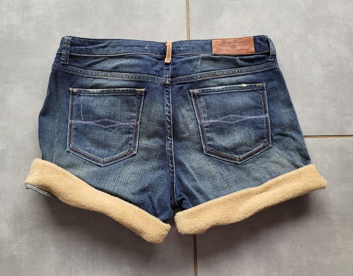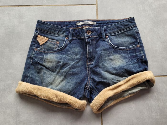 Short en jean, avec polaire beige sur le bas, de la marque Zara, taille 40, en très bon état. Article lavé pour la vente.