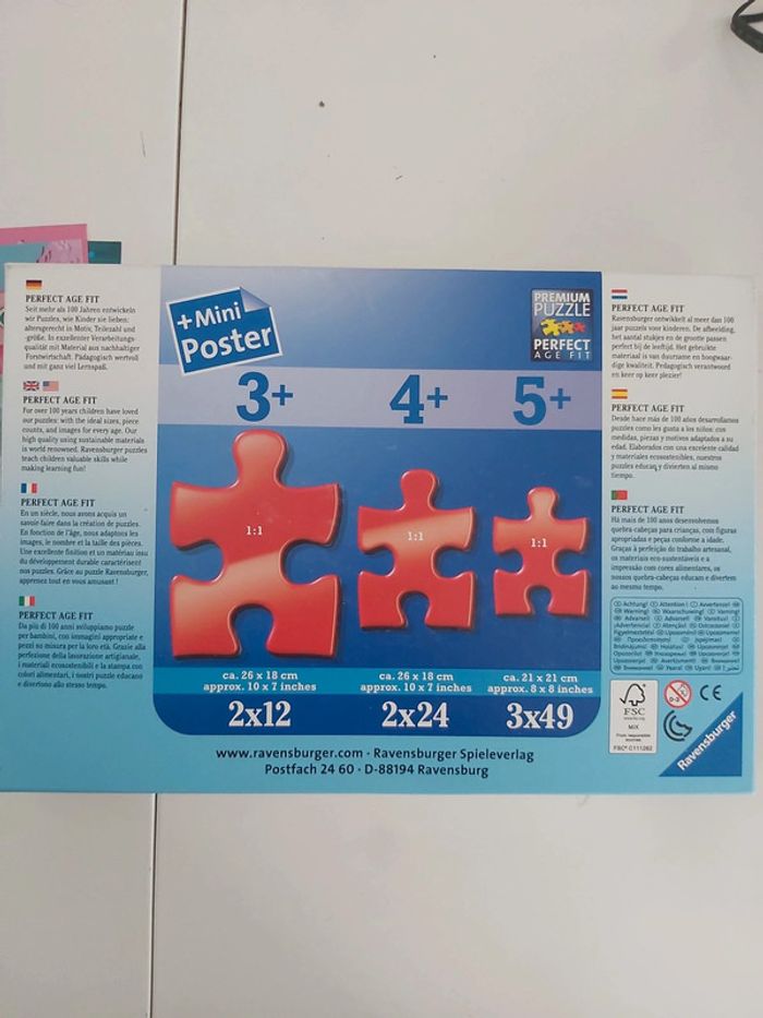 Ensemble de 3 puzzle de 49 pièces. 5 ans et plus avec posters. 21 cm x 21 cm