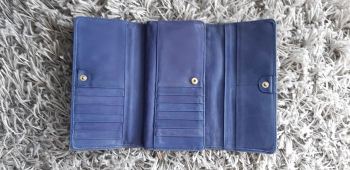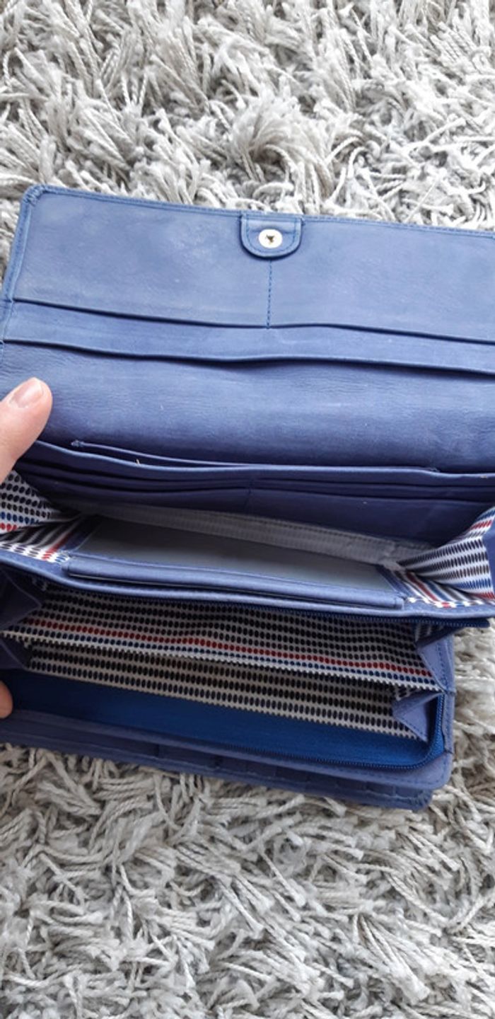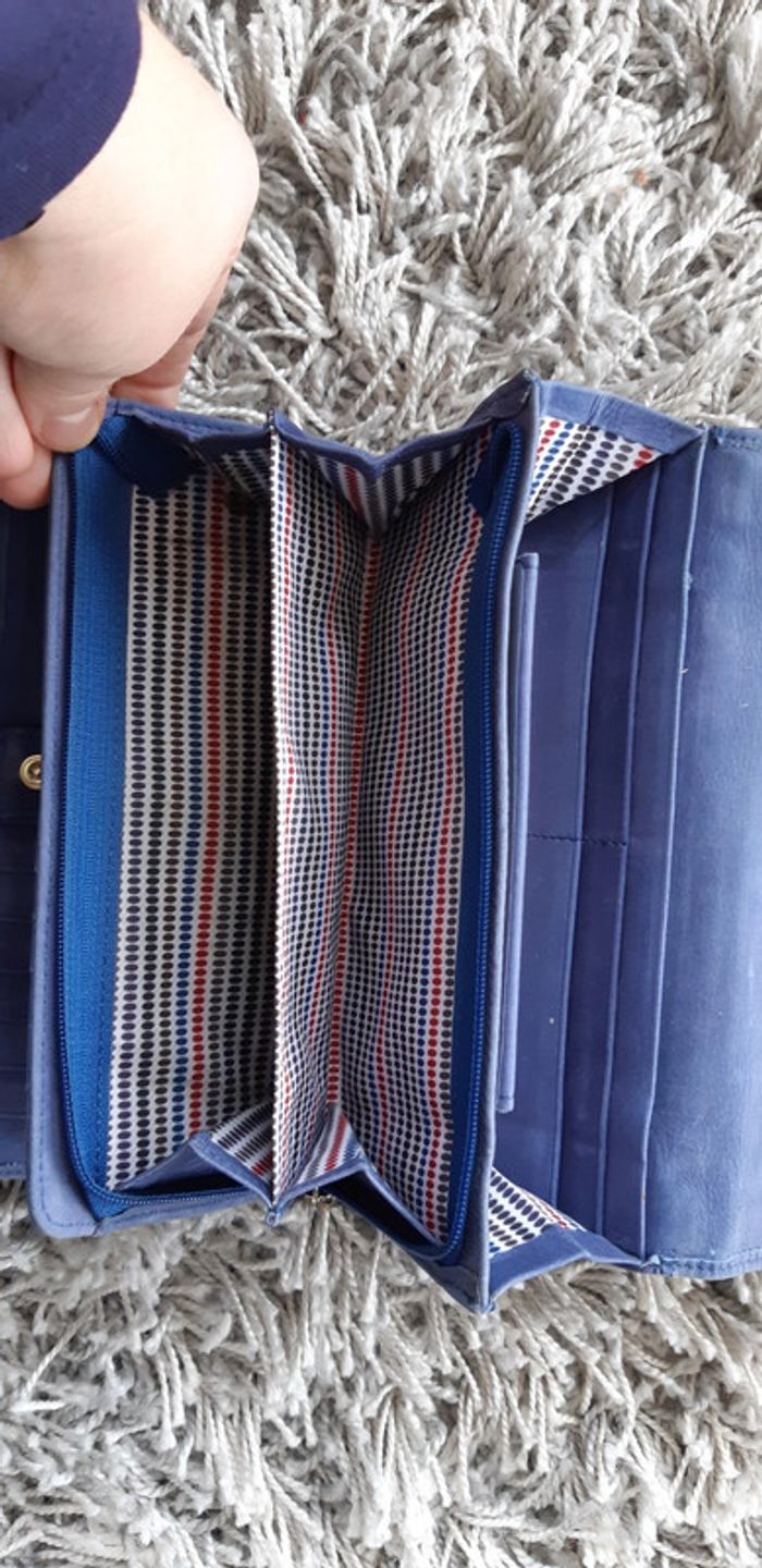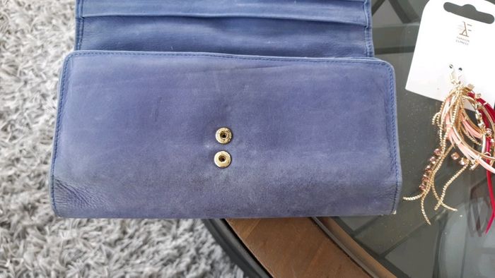 Cuir bleu. En bon etat Une petite tache bleu fonce cote pile en bas du portefeuille mais ne choque pas. On dirait que ca fait parti du cuir. Cuir non neuf.