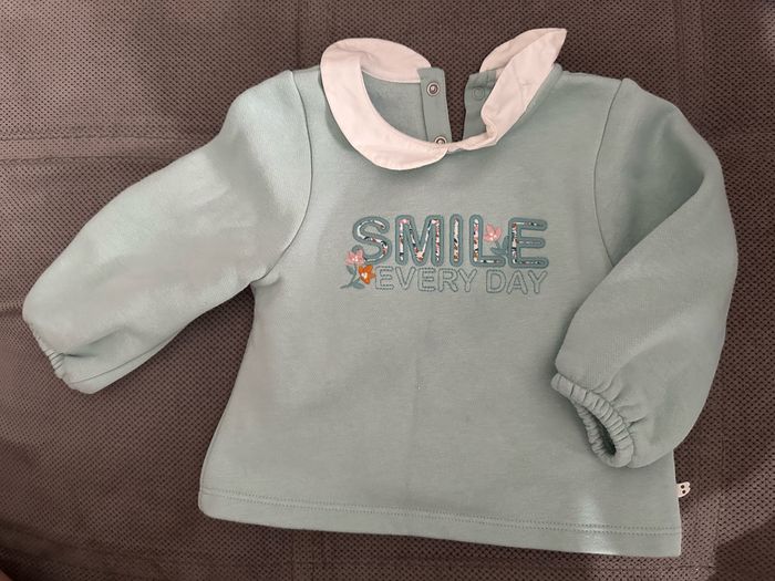 Ce sweat-shirt de chez Kiabi est molletonné couleur bleu clair Convient à un bébé de 6-7 mois mesurant 74 cm