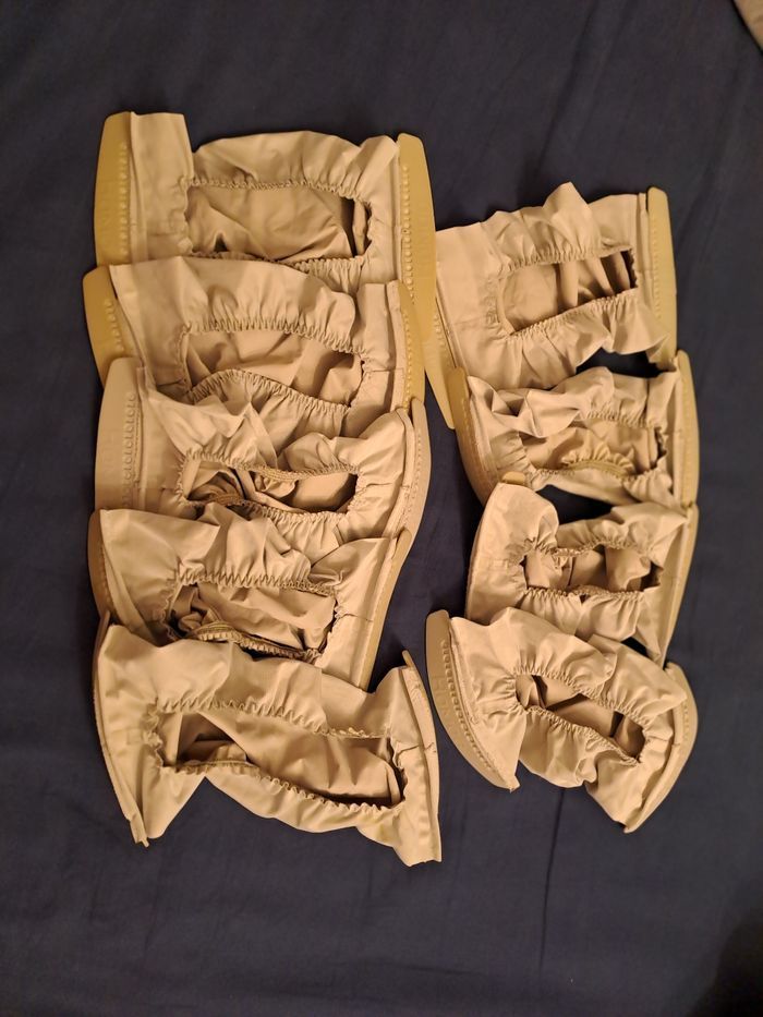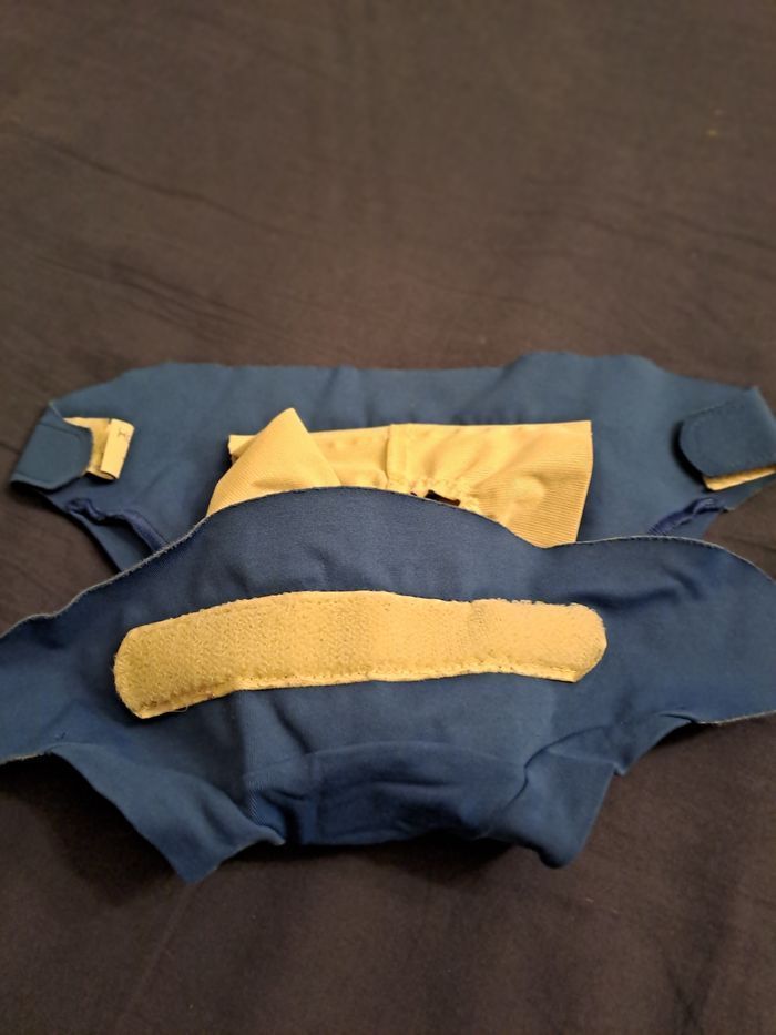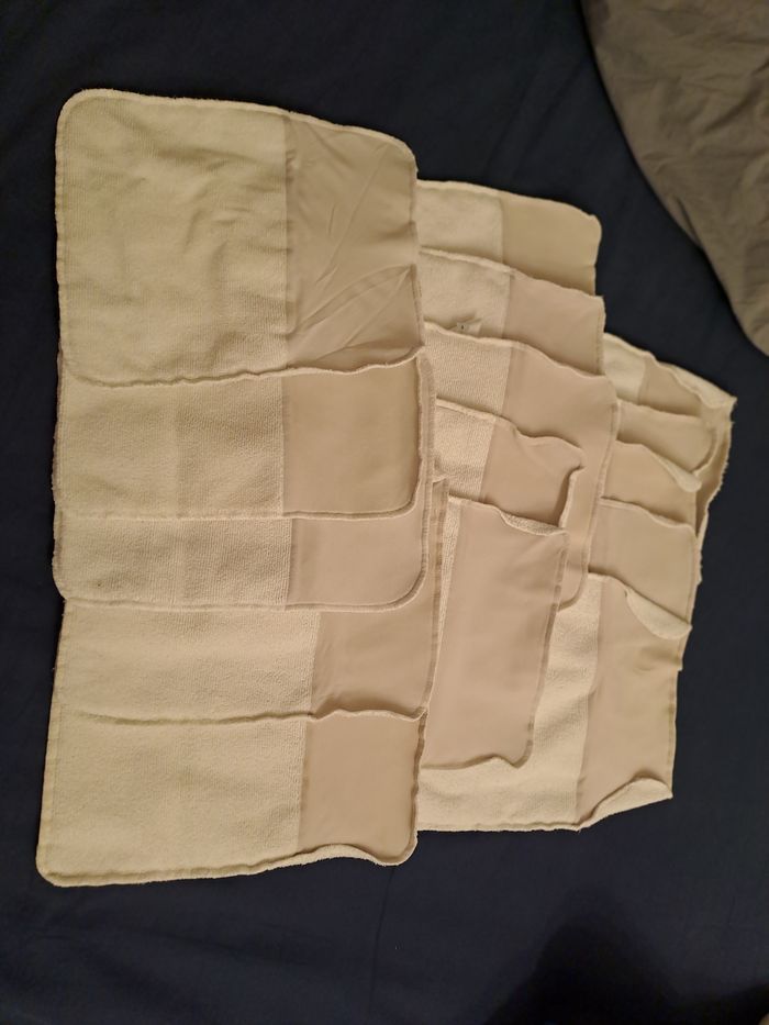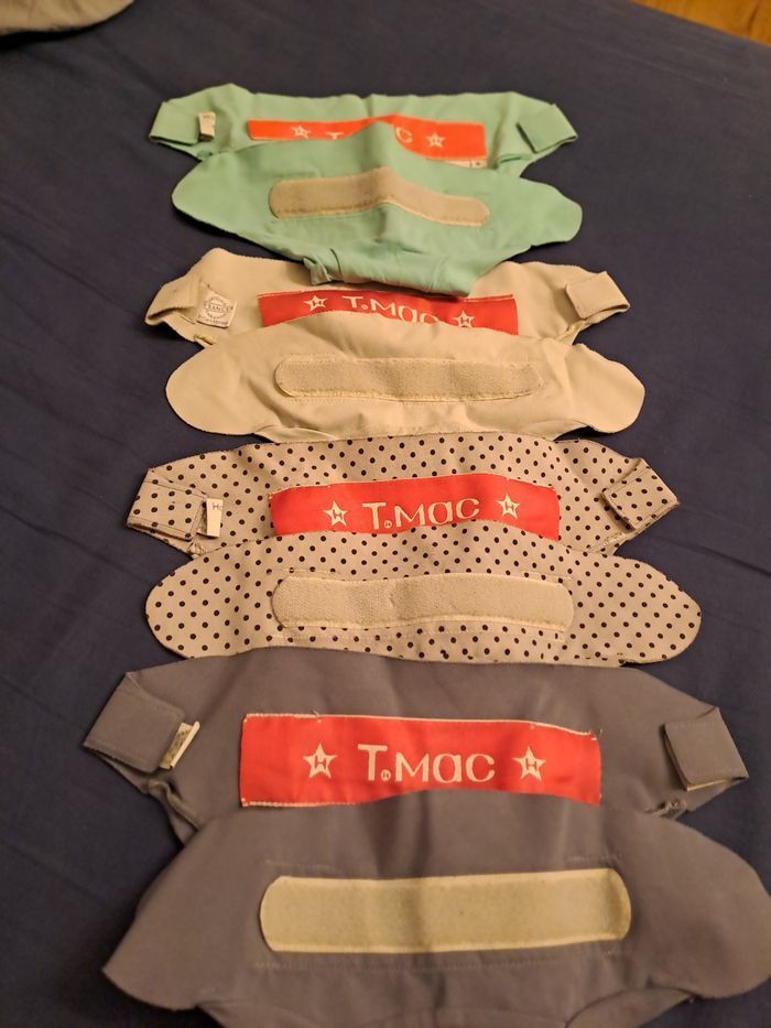 Lot de 4 couches lavables TMac S + 10 inserts+ 1 couche lavable classique +15 absorbants en coton + 1 absorbant de nuit Tout est en bon état voire très bon état. Lavage selon les recommandations de la marque avec lessive de la marque, percabonate toutes les 4 semaines, velcro des couches en parfait état, pas de tâches.