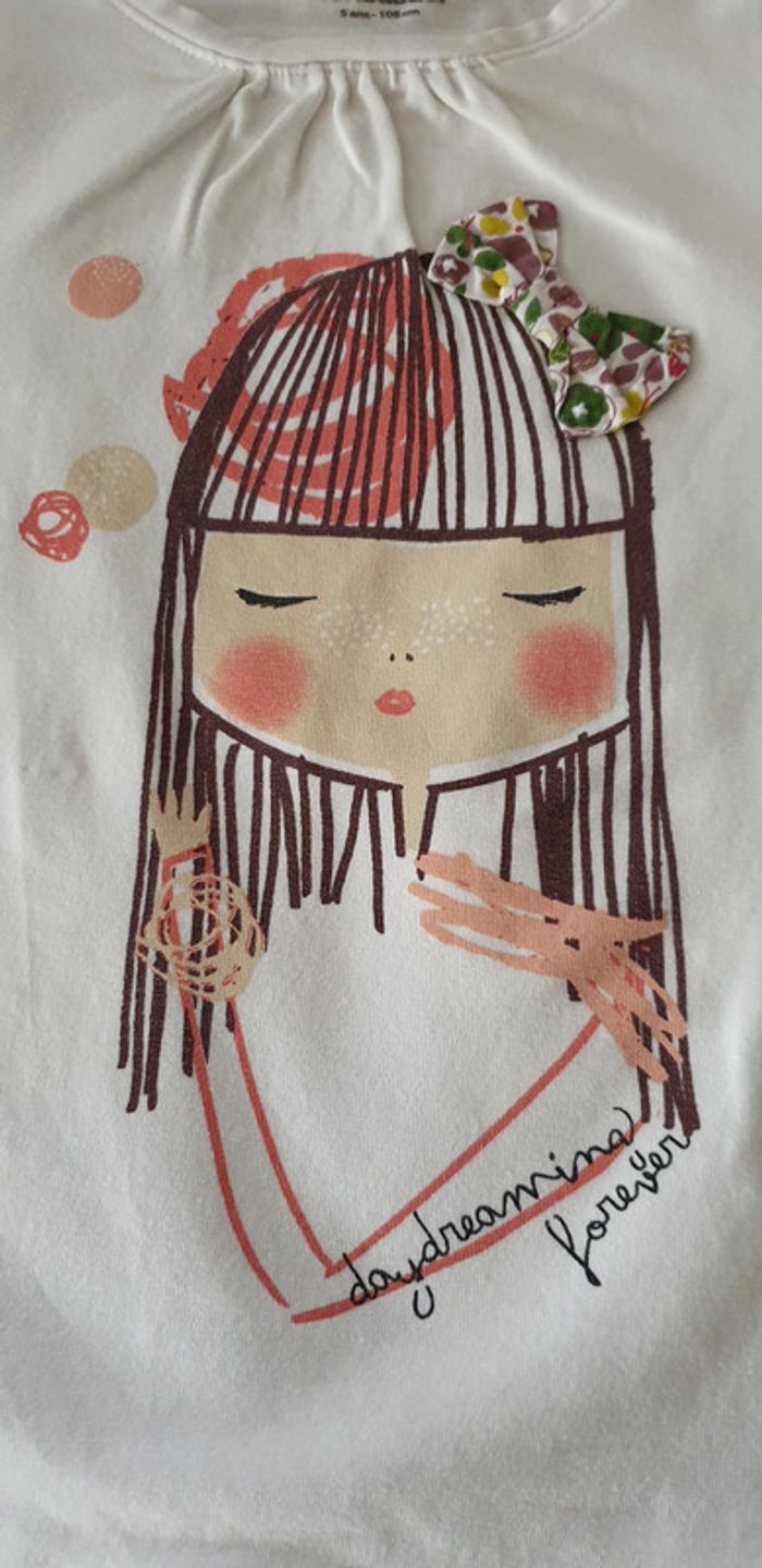 Tee-shirt manches longues crème avec visage petite fille printé dessus. Le nœud dans ses cheveux est en tissu. État impeccable.