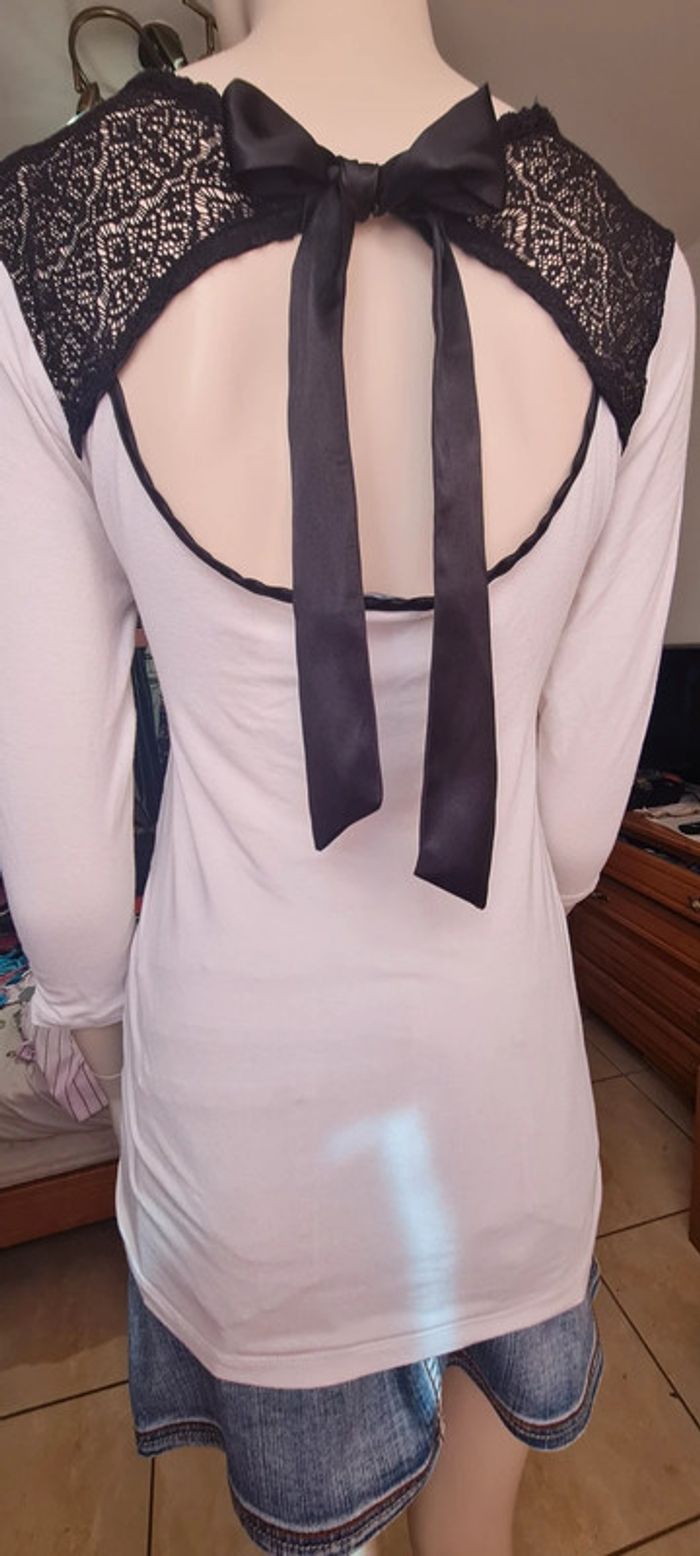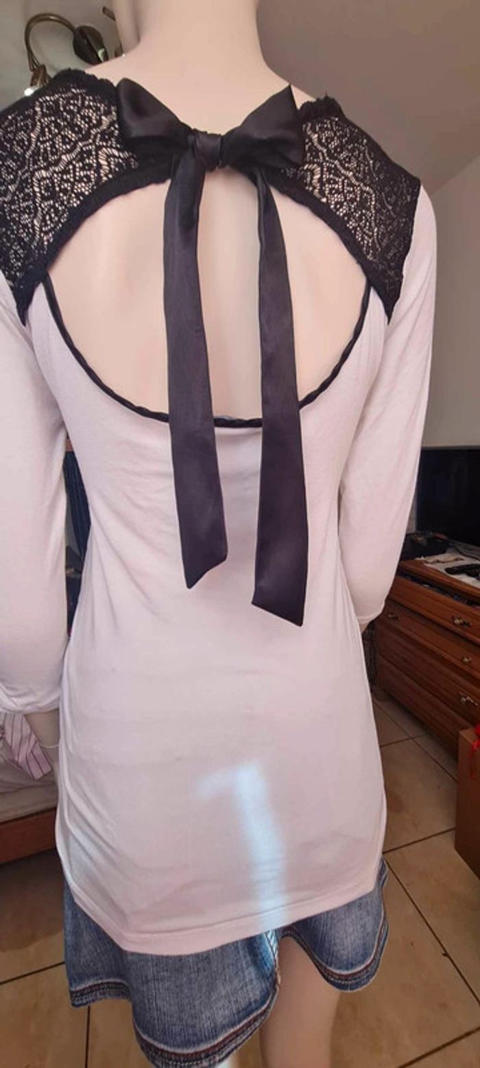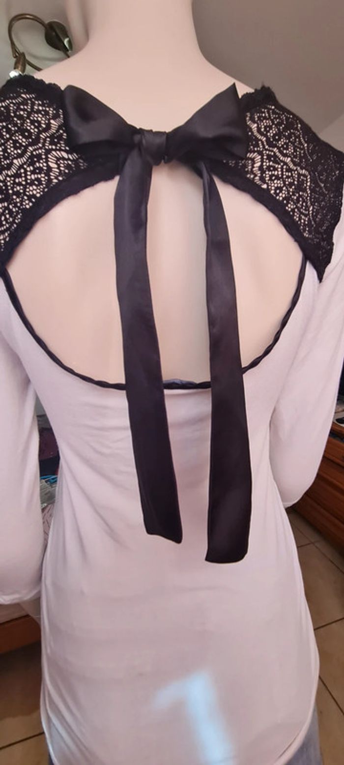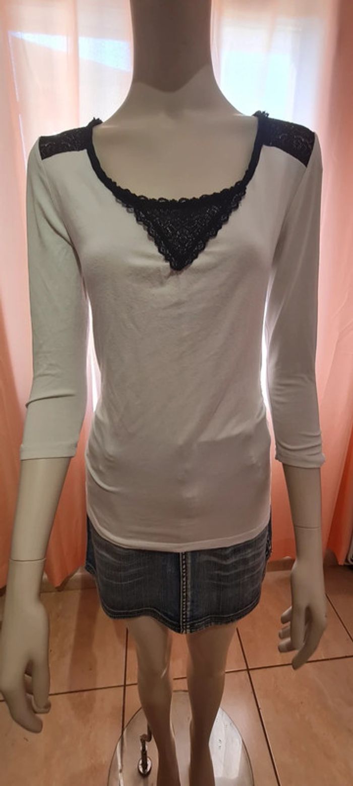 Debardeur dentelé manche 3/4 Couleur Blanc, noir Marque BRÉAL Taille 38 Mesure d'aisselle à aisselle 42 cms Longueur 62 cms