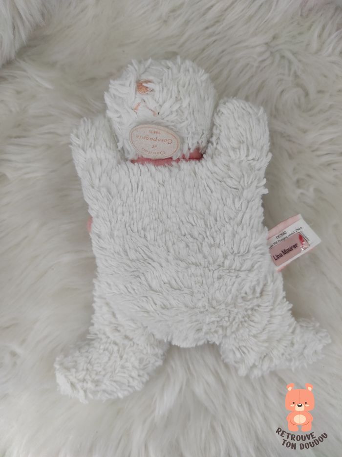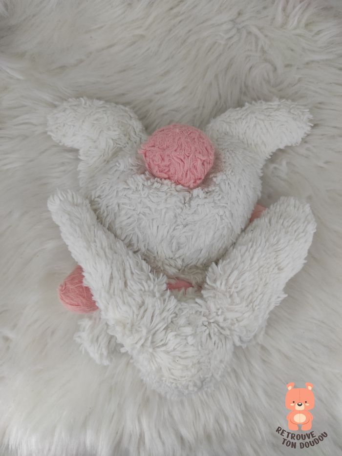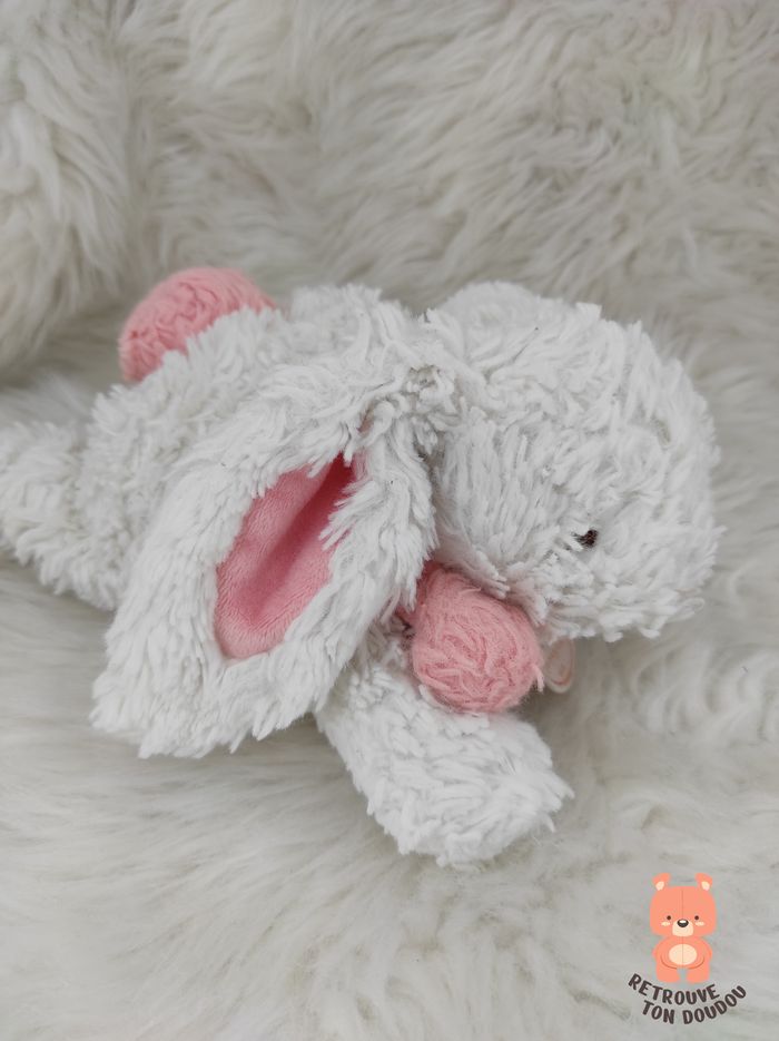 🐇 Doudou Lapin Blanc Pompon Rose Corail en position allongée. Réf fabriquant : DC2682 📏 Dimension : 25 cm environ ✨ Occasion, Correct, déjà utilisé et passé plusieurs fois en machine à laver. Prénom de l'ancienne propriétaire sur l'étiquette tissu. 🧼 Lavé avec lessive hypoallergénique 👀 Vous achetez le doudou que vous voyez sur les photos.