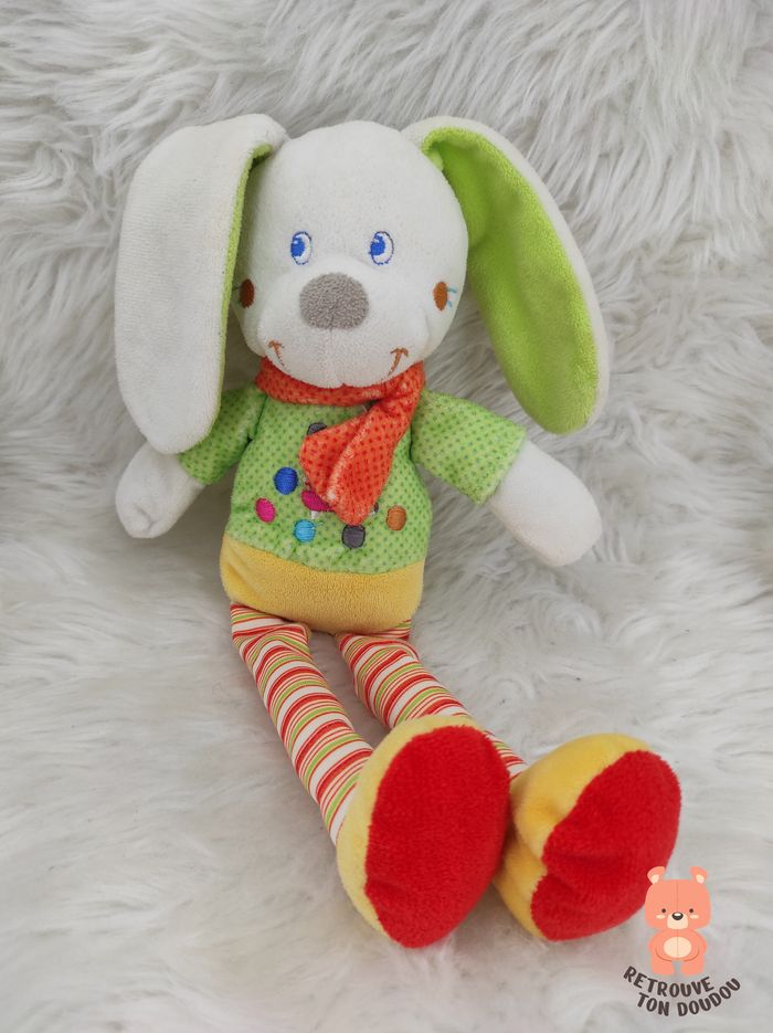 🐇 Doudou Lapin ou Chien Vert Jaune et Orange, brodé, Mots d'Enfants, Leclerc 📏 Dimension : 30 cm environ ✨ Occasion, très bon état 🧼 Lavé avec lessive hypoallergénique 👀 Vous achetez le doudou que vous voyez sur les photos.