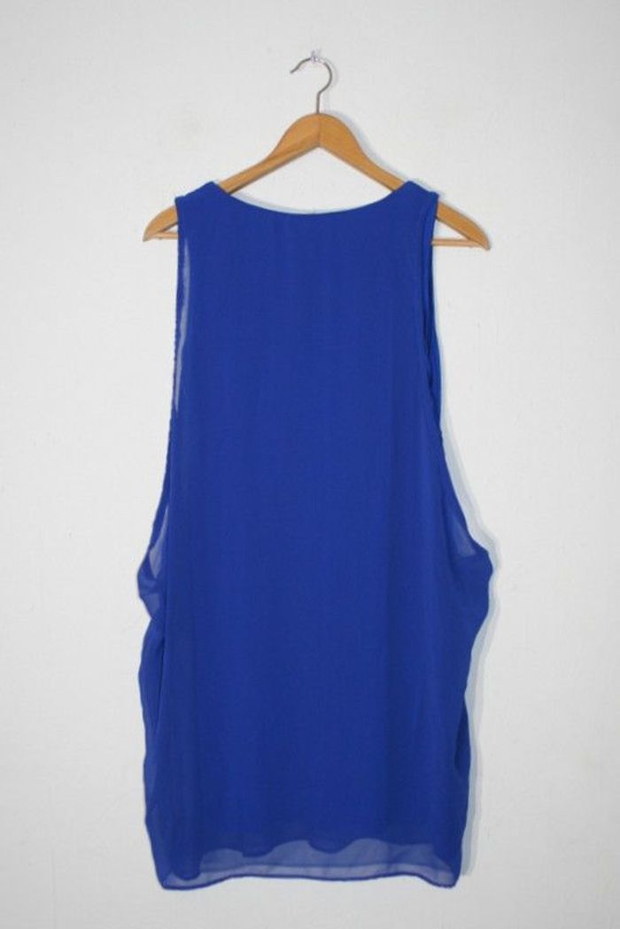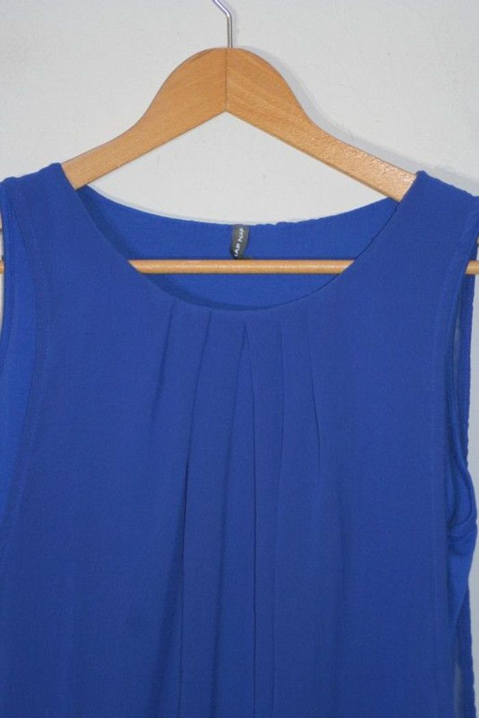 Robe sans manche ou tunique bleue de chez NafNaf, taille XL (env.44/46), voile (100% polyester)+ doublure fond de robe (98% viscose + 2% élasthanne), 88cm de long, 240g