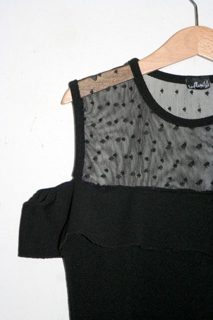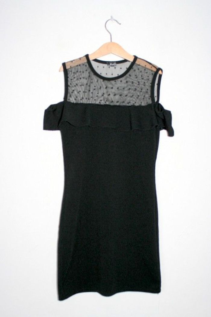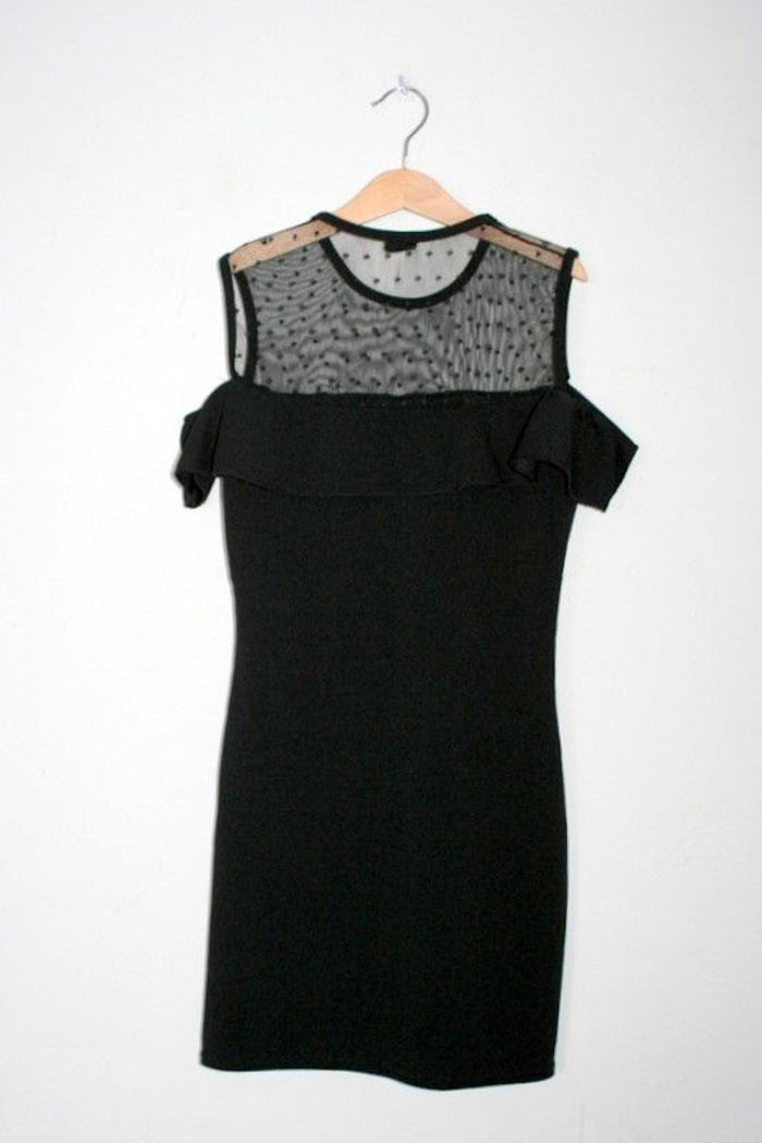 Robe noire marque Influx, taille XXS, 73cm de long, 37cm d'aisselle à aisselle, point de couture à faire au niveau de l'aisselle en dessous du volant, 95% polyester / 5% élasthanne, 130g