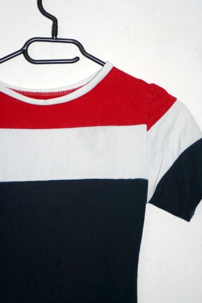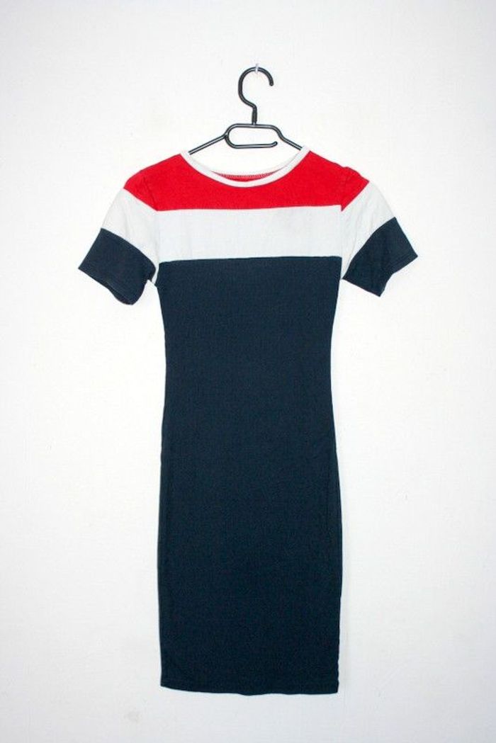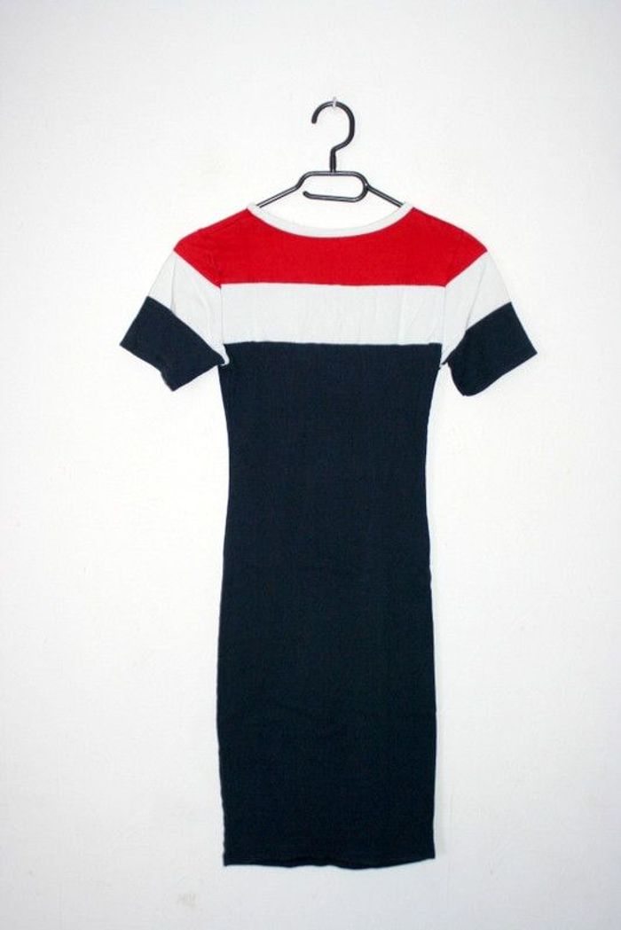 Petite robe moulante rouge/blanc/bleu marine, bien portée, sans étiquette de taille mais correspond à un XS, 86.5cm de long, 33cm d'épaule à épaule, 33cm d'aisselle à aisselle, 95% coton / 5% élasthanne, 190g
