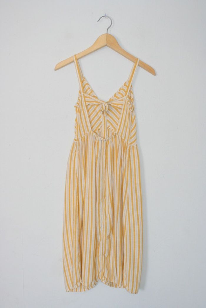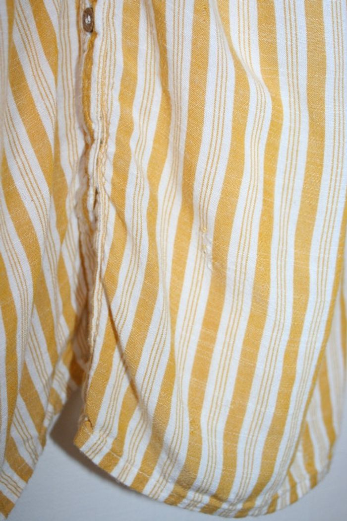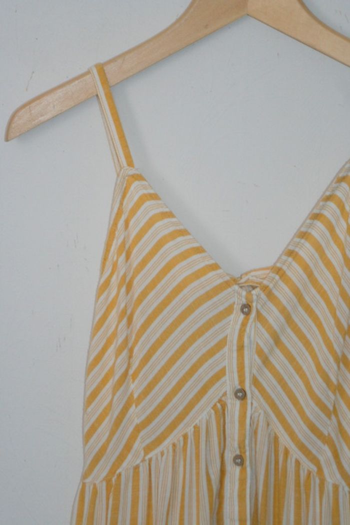 Robe d'été rayée blanc/moutarde de chez Kiabi, taille S, 102cm de long, 37cm d'aisselle à aisselle, plusieurs petits trous sur le bas et quelques fils tirés, 100% viscose, 180g