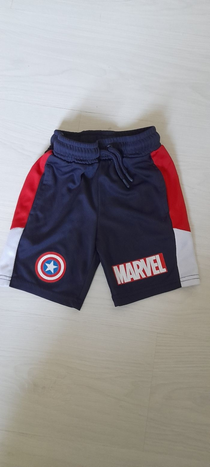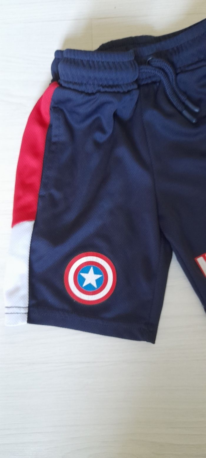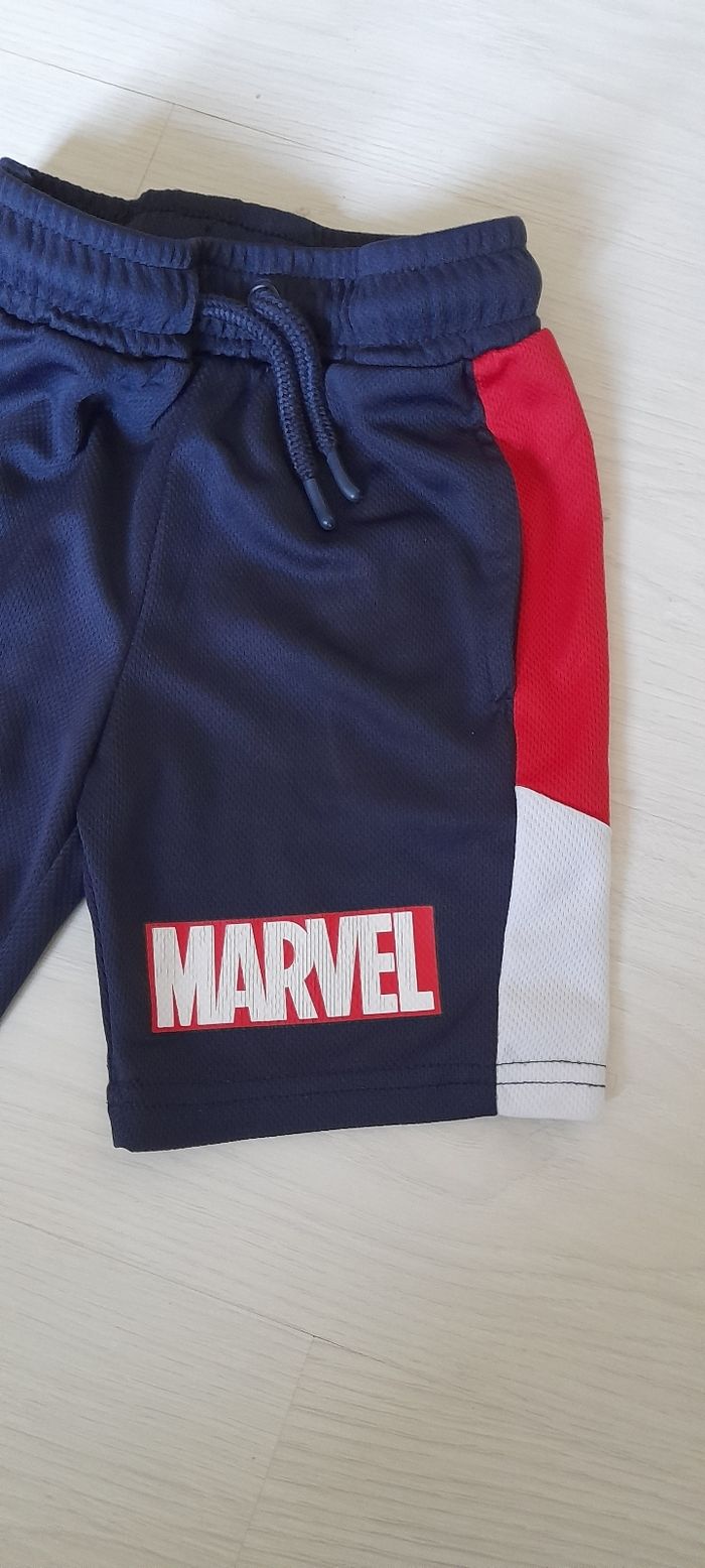 Ensemble Marvel T 4 ans Marque PRIMARK Couleur bleu marine avec motifs devant et arrière pour le Tee-shirt et devant sur le short Short taille élastique avec cordon et 2 poches devant 100 % Polyester Quasi neuf porté maxi 1 fois