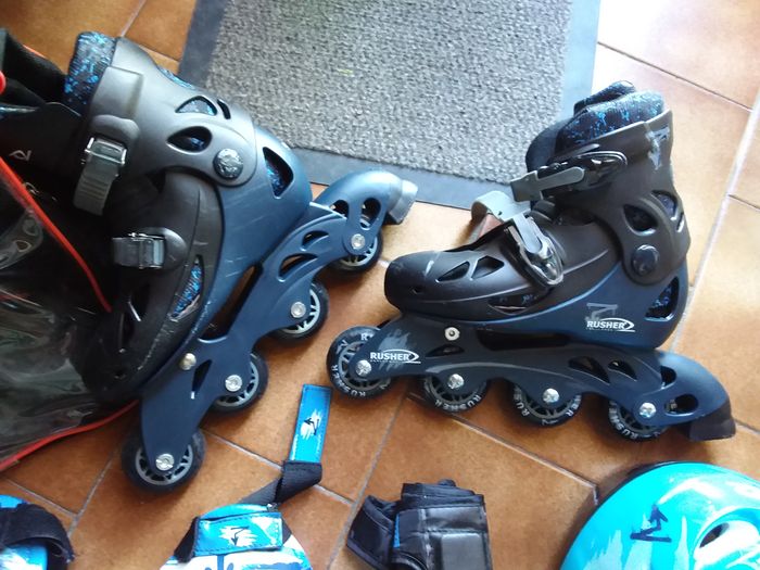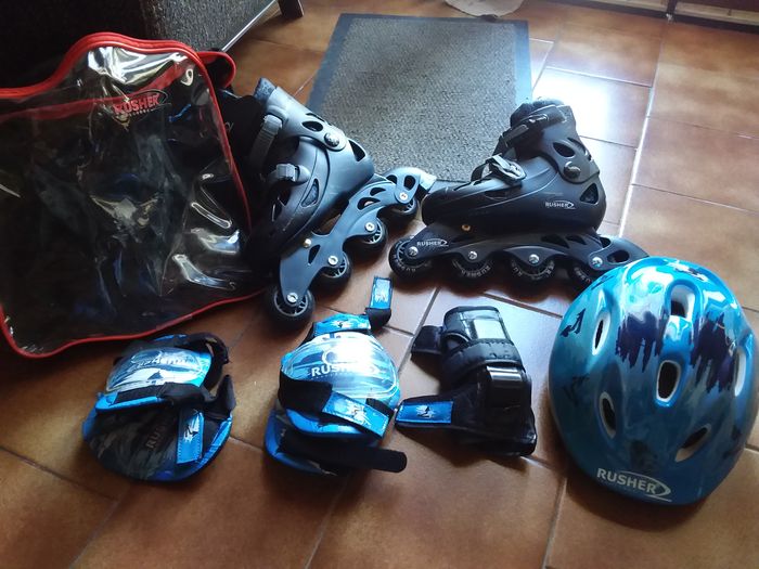 Ensemble rollers ,DE MARQUE rusher.pointure evolutive,du 33 au 36,avec toutes les protections et un casque taille s,50,52 cm.le tout en tres bon etat .quazi pas servi .prix55e.