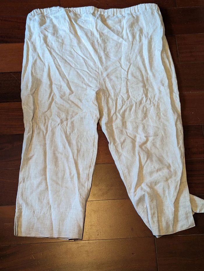 Ensemble en lin pour la grossesse composé d'une blouse et d'un pantalon large Couleurs blanc et beige Taille 3 (taille plutôt grand) Le pantalon est fluide et peut se resserrer a.la taille avec un élastique Peu porté