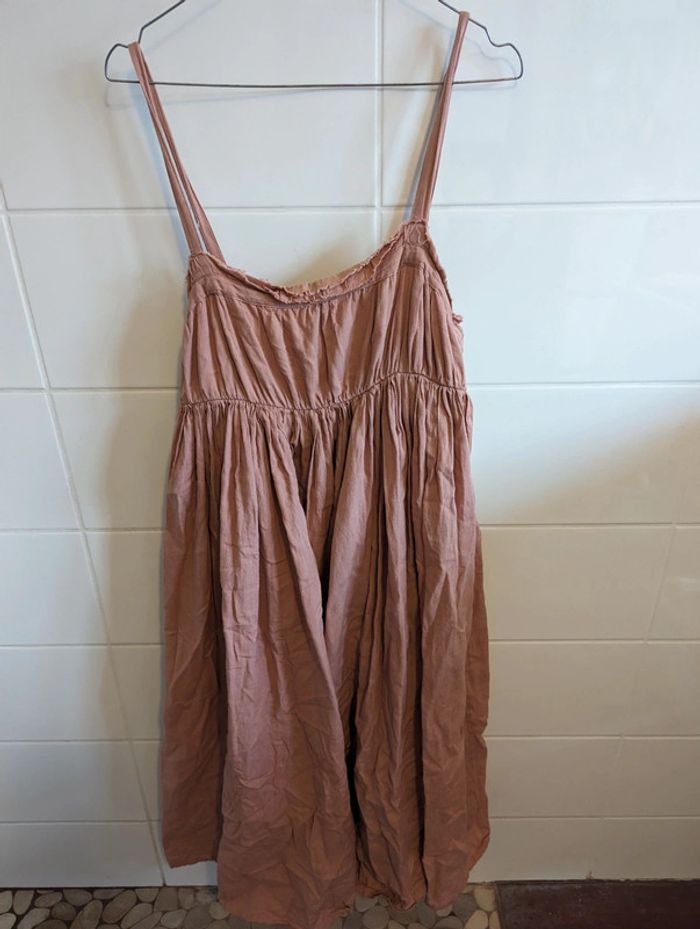 Robe grossesse longue et vaporeuse Couleur rose saumon/beige rosé Taille 40 mais assez resserrée a la poitrine, peut également convenir a un 38 Plutôt longue, effet drapé Très bel effet