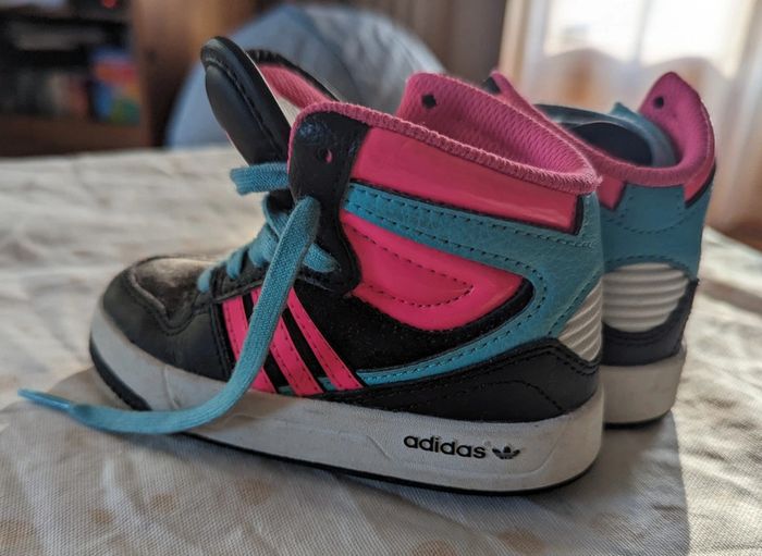 Baskets hautes noires et roses adidas Lacets bleus Peu portées, très bon état