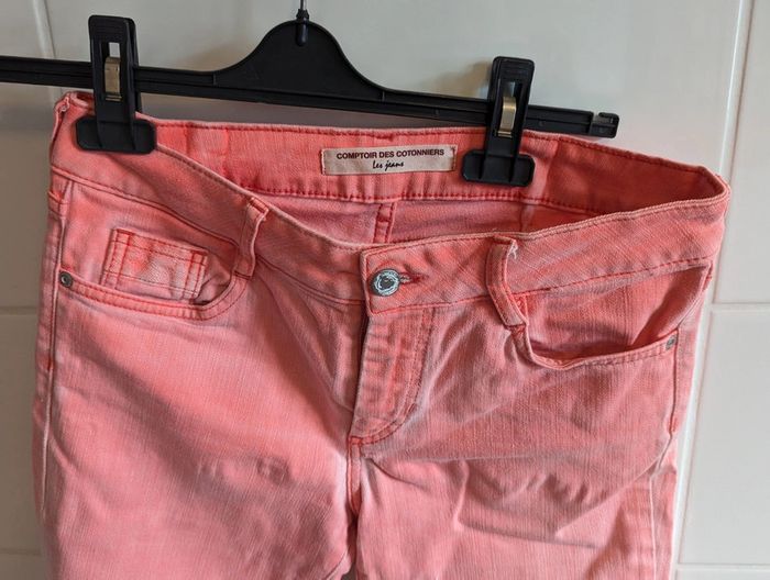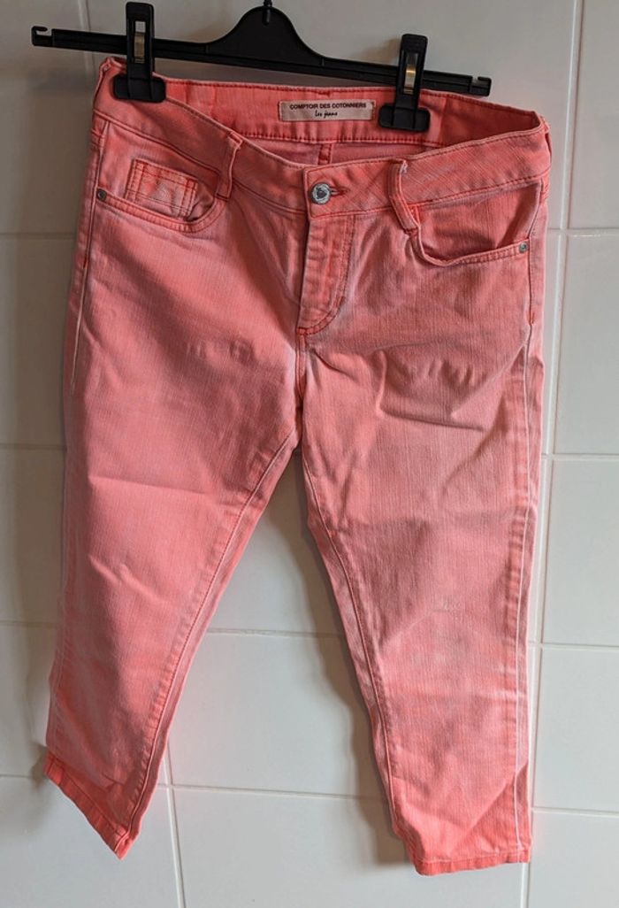 Jean Longueur 3/4 de la marque Comptoir des cotonniers Couleur rose/corail un peu fluo Taille 38 (attention la marque taille petit) Je l'ai acheté pour sa couleur mais malheureusement il est trop petit pour moi Très bon état