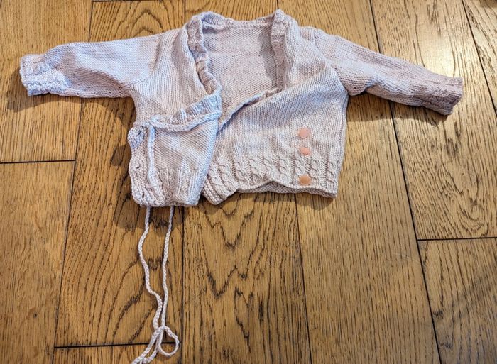 Gilet/cache coeur tricoté main Taille estimée 6m Se ferme avec des boutons sur le côté + lien de serrage Manches longues Couleur rose claire Porté mais bon état #maevafille6mois