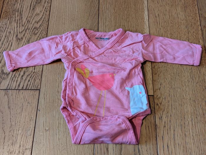 Body 1 mois Vertbaudet Rose foncé avec motifs oiseaux colorés sur le devant Peu porté, très bonne état #maevafille1mois
