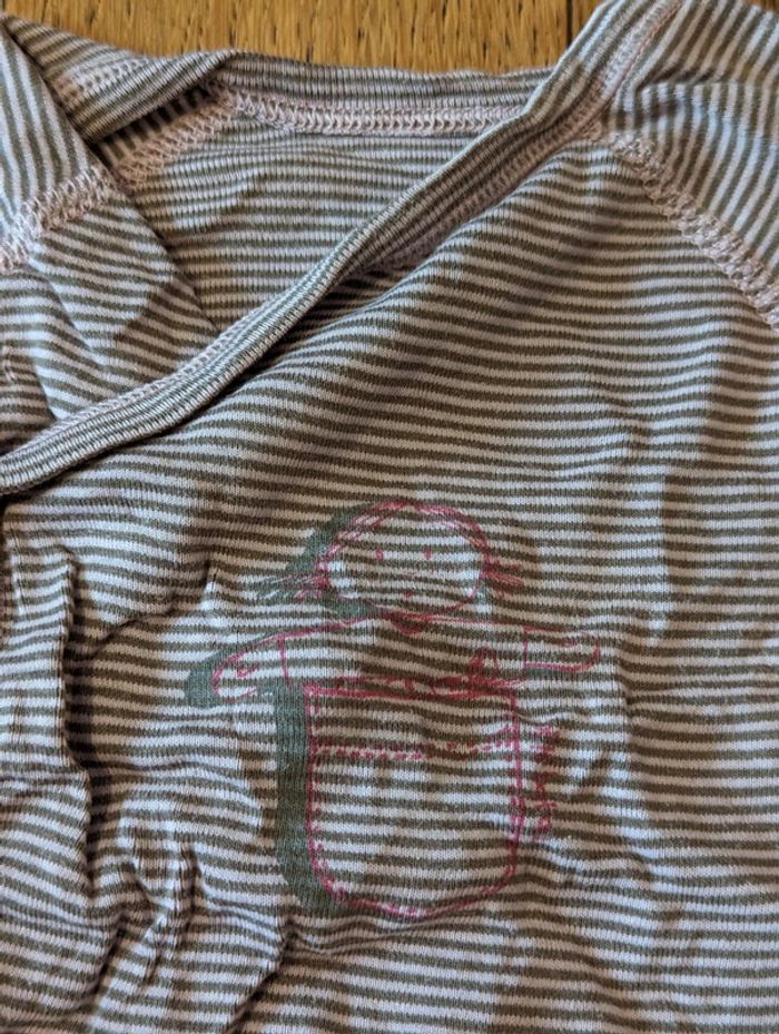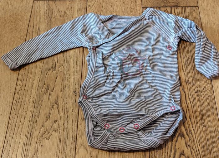 Body croisé Petit Bateau Taille 3 mois Rayé, tons violet foncé et gris avec motif petite fille/poupée rose sur le devant Porté mais bon état #maevafille3mois