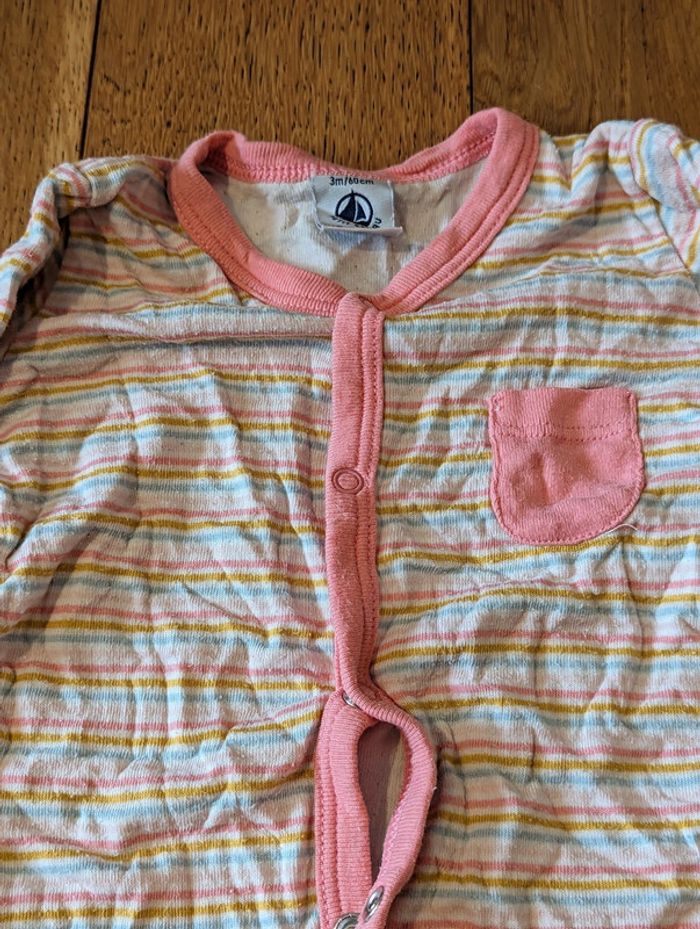 Combinaison rayée multicolore Marque Petit Bateau, taille 3 mois Boutonnée par pressions de haut en bas, ce qui permet de l'enfiler facilement Porté mais bon état #maevafille3mois