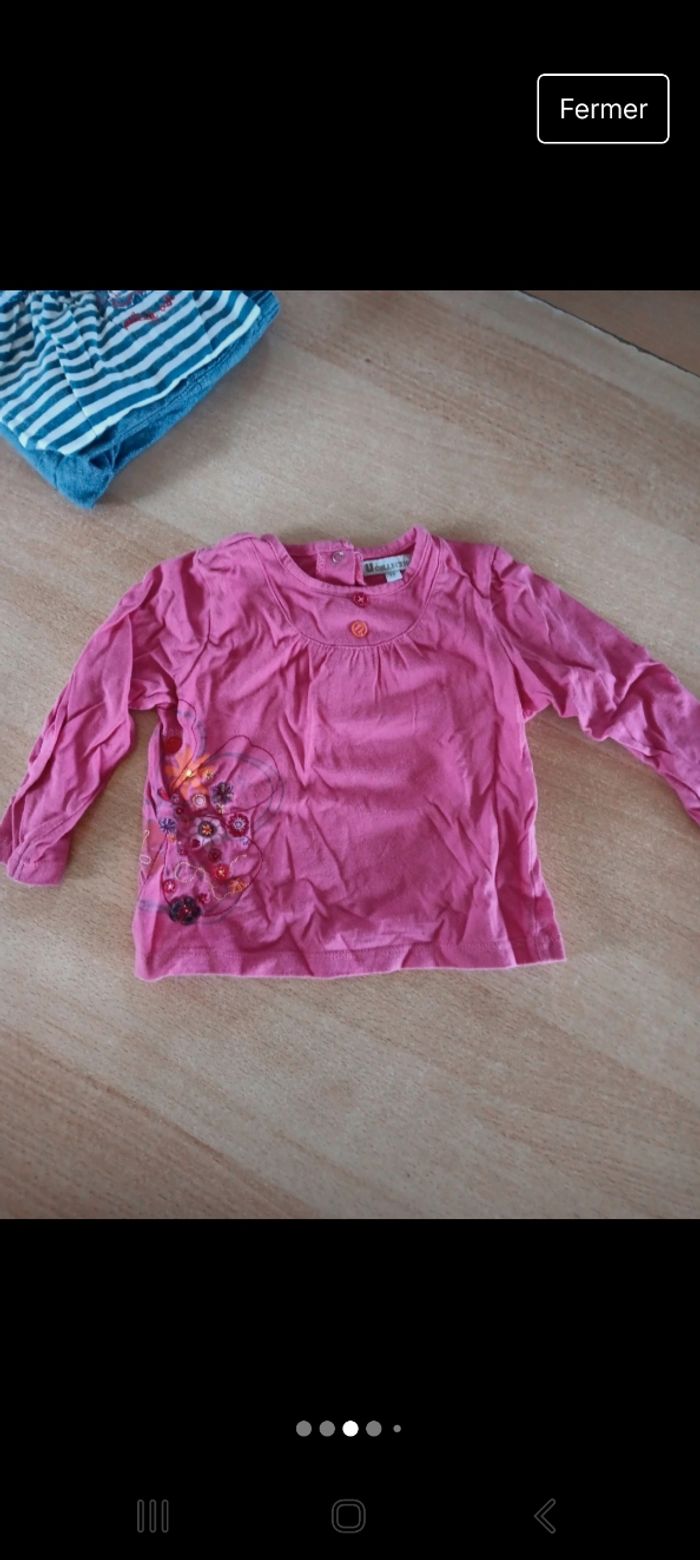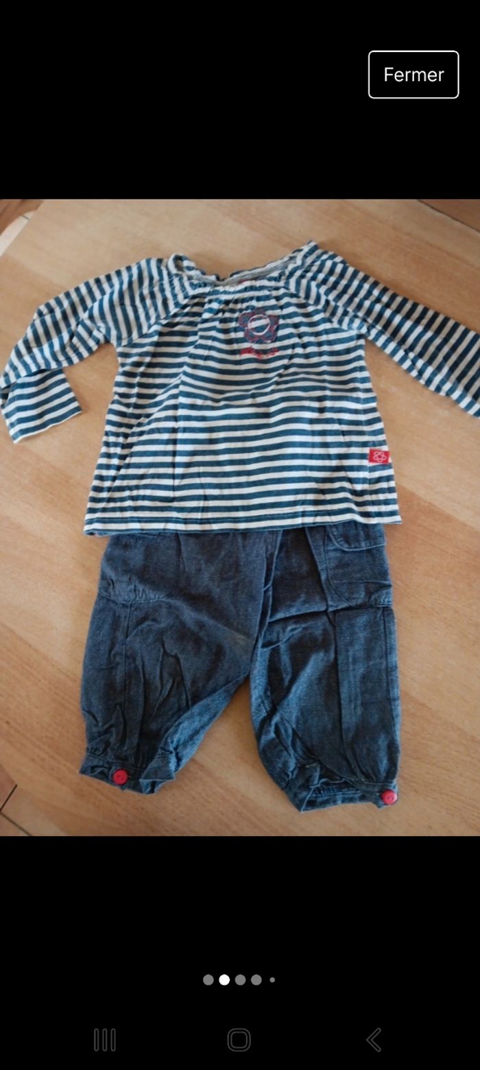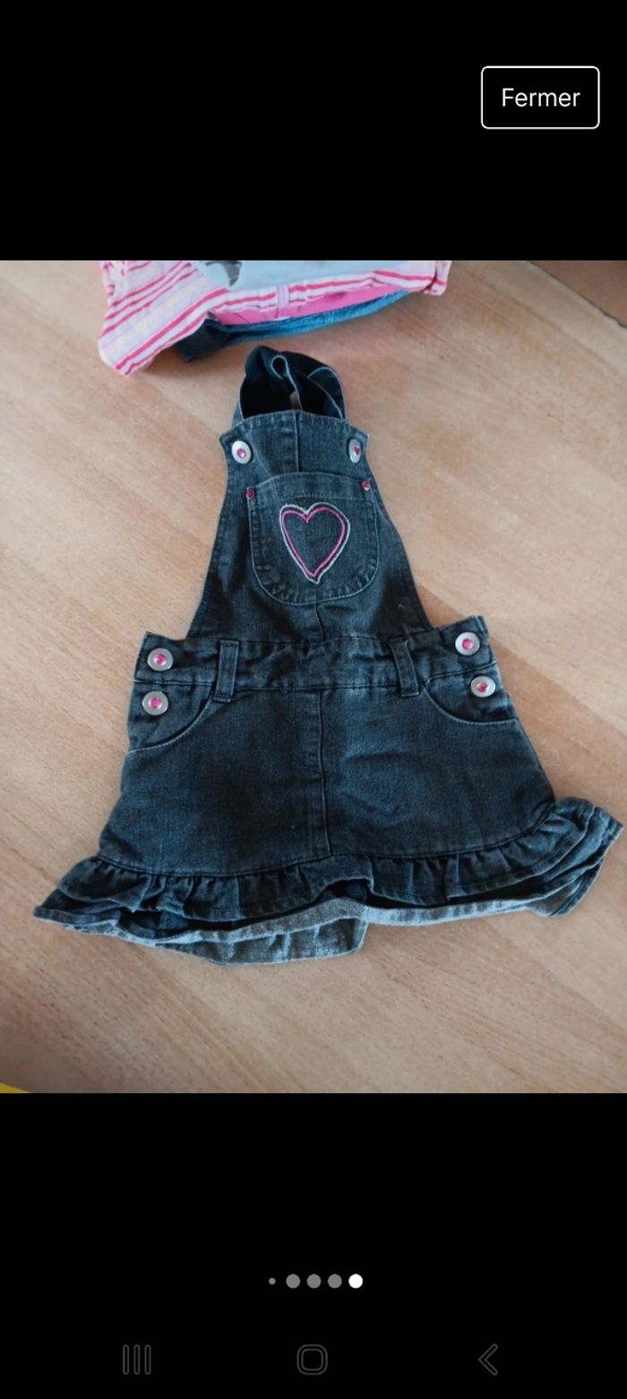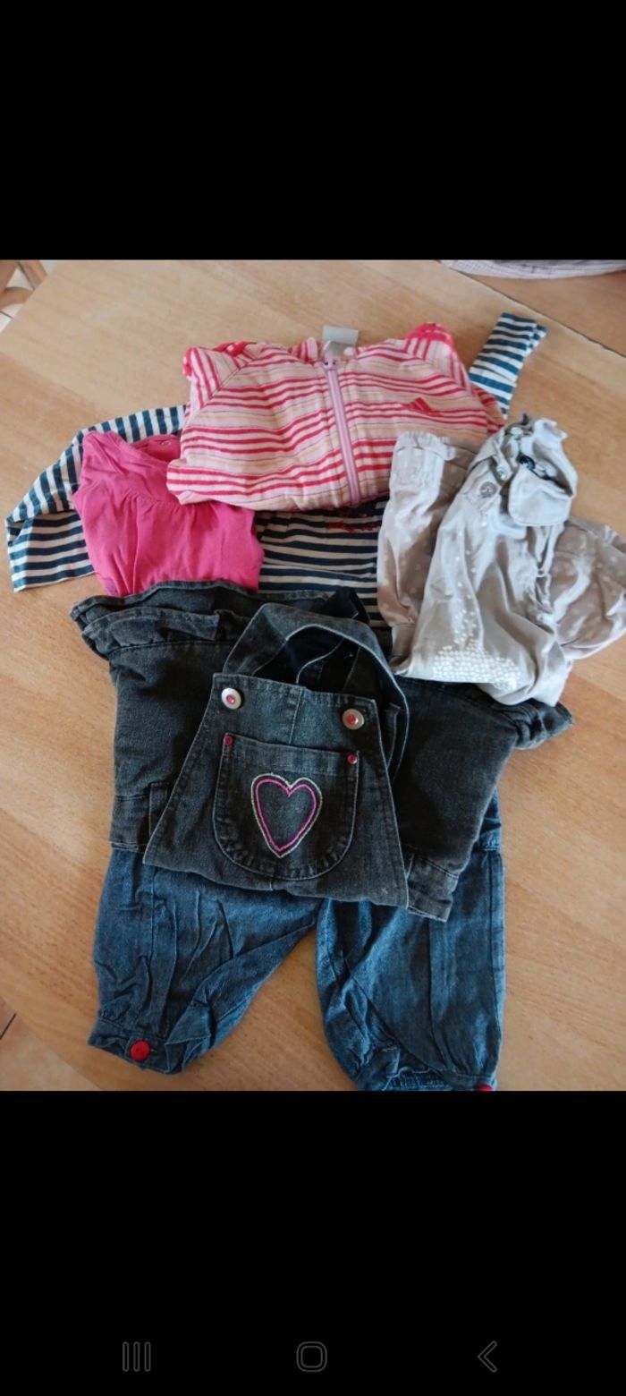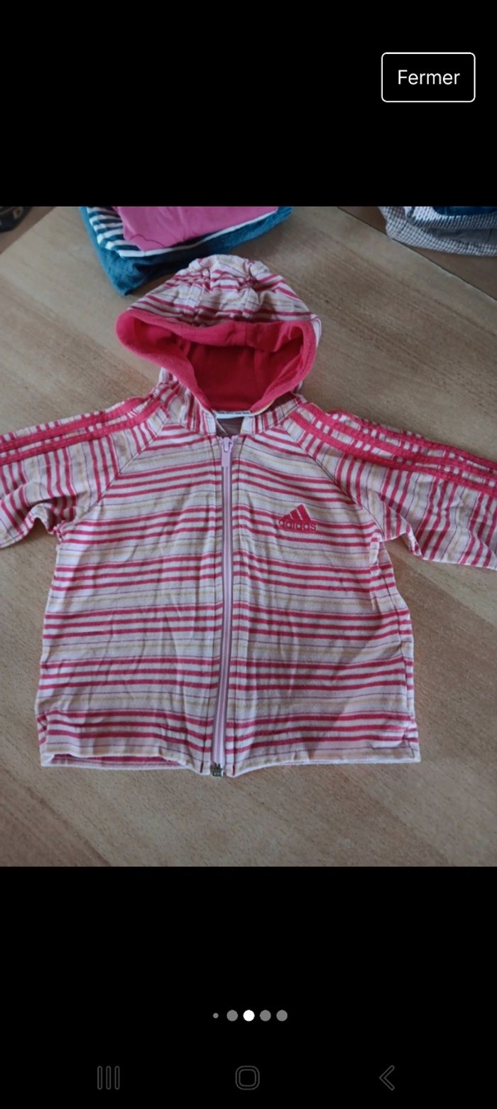 2 robes: 1 grise en jean Kimbaloo 1geisr avec cœur blanc sans manches Tout compte fait 1 gilet fin Adidas à capuche A tee shirt rose motif fleurs 1 ensemble pantalon fin et mariniere Tout en 18 mois.