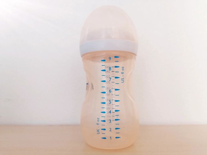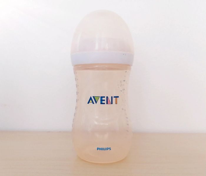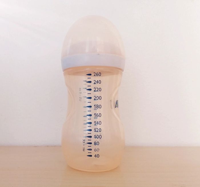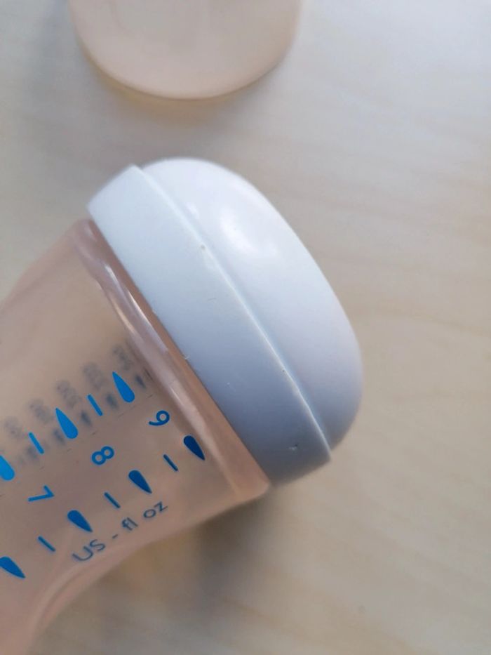 Biberon marque avent de chez Philips En bon état. 260ml / 9 US-fl oz Il a bien servit mais a encore toute son utilitée, à noter quelques traces d'usure sur le col blanc ainsi que sur le biberon, il est également teinté par son utilisation. Il n'est pas fournit avec une tétine. I