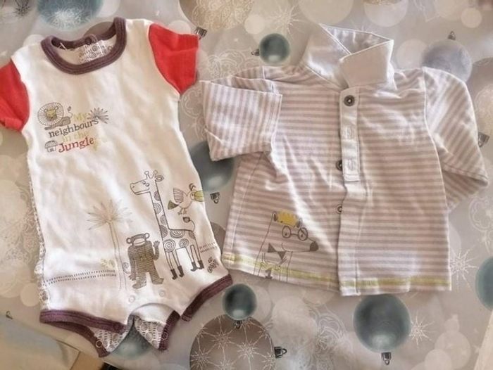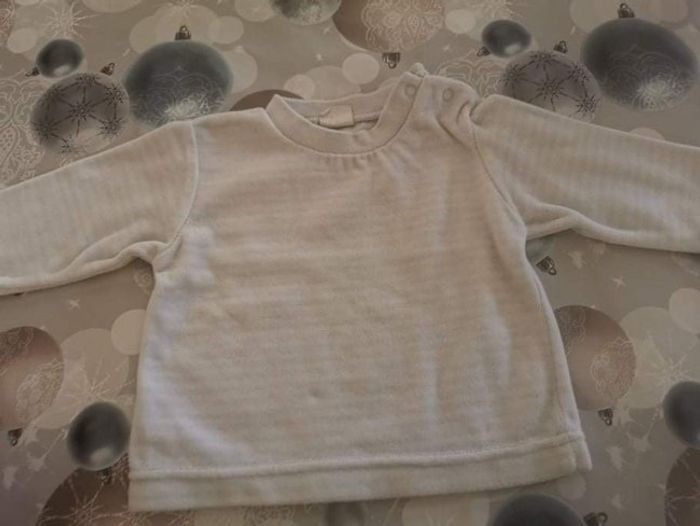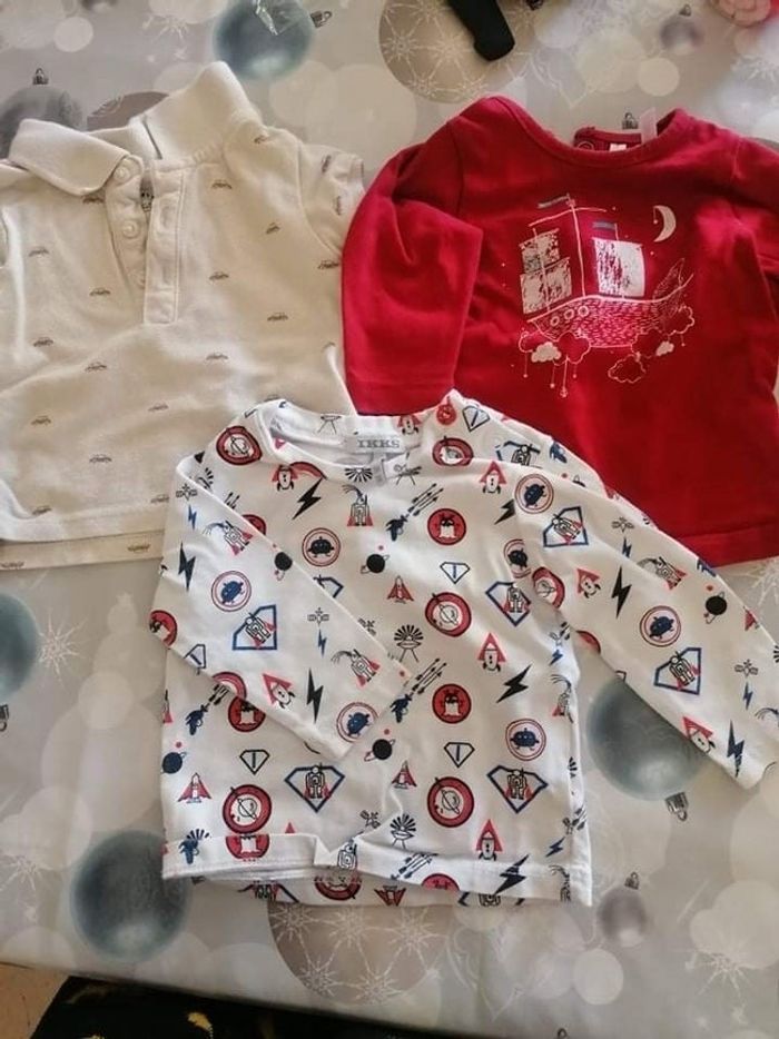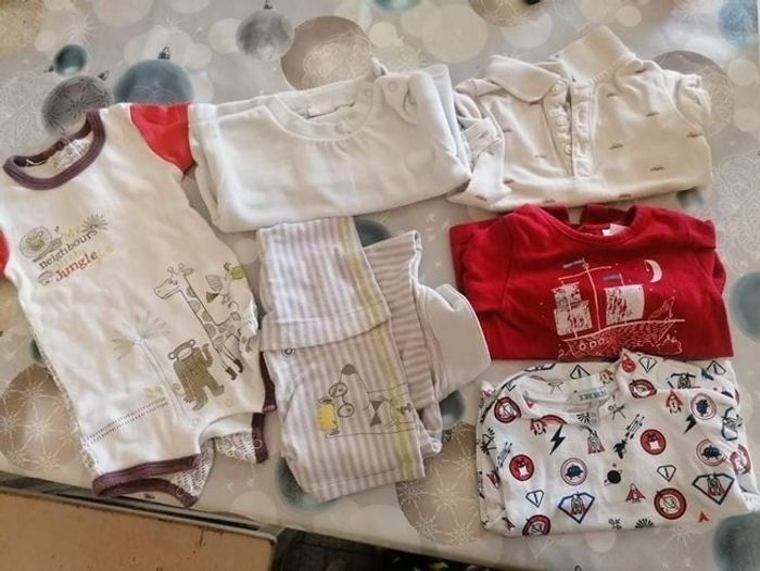 Lot comprenant : - 1 t-shirt manche courte - 3 t-shirts manches longues - 1 combishort - 1 haut de pyjama (blanc/gris et rayures bleues ciel) Le lot est en très bon état