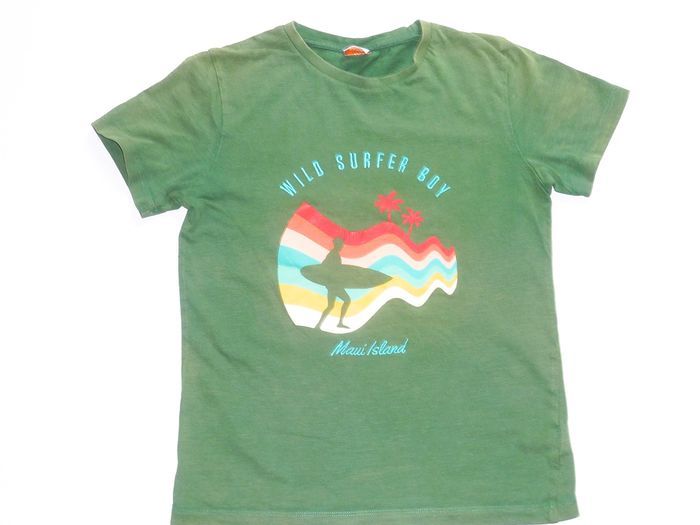 Tee shirt de marque TAO en état excellent, couleur verte, orné d'une animation estivale colorée.