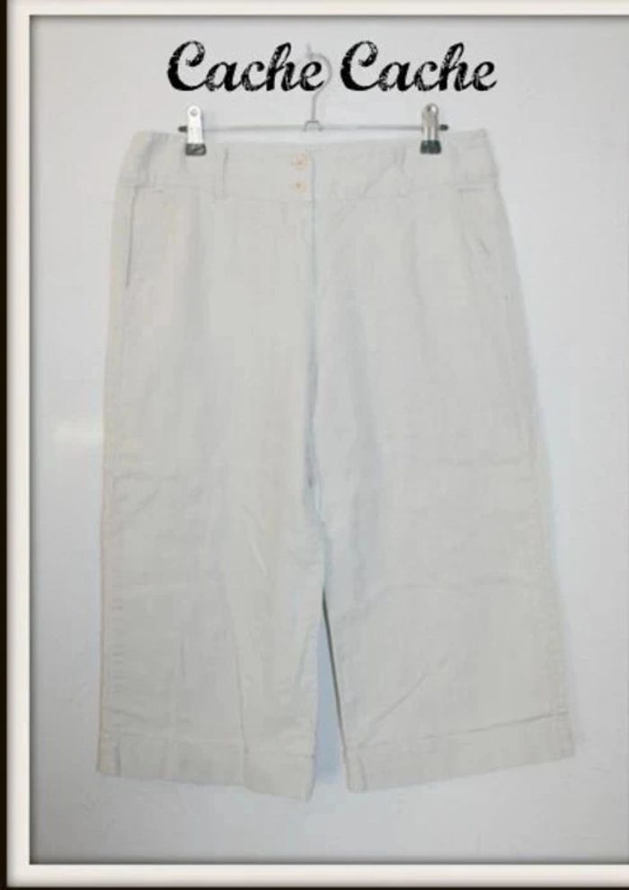 Pantacourt en lin beige finement rayé Cache Cache taille 42, taille 39cm, longueur 73cm, 50% lin, 50% coton, 270g