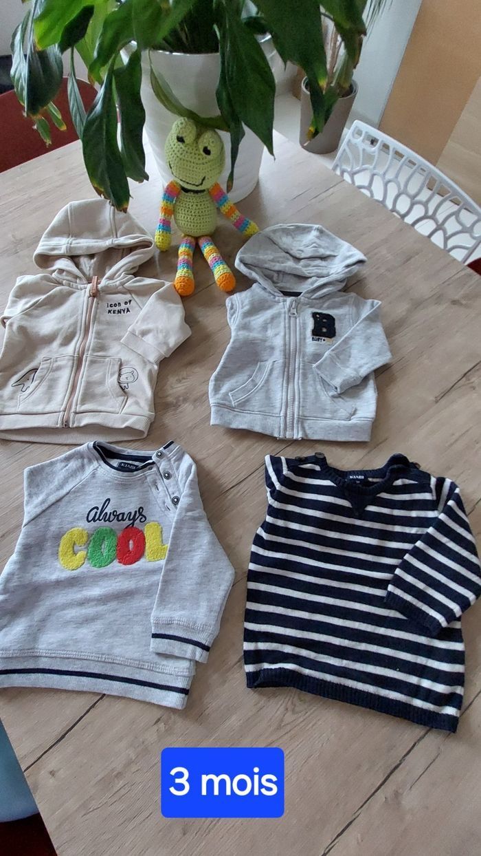 Lot 4 pièces composé de 2 pull + 2 sweat zip à capuche - Orchestra et Kiabi Taille : 3 mois Vêtements lavés et mis dans caisse plastique En excellent état Je prends soin des vêtements, n'hésitez pas à consulter mon dressing pour d'autres articles 😉