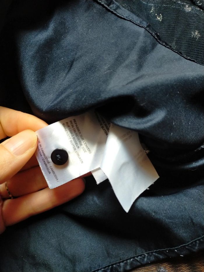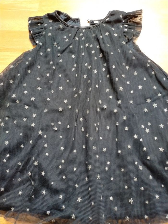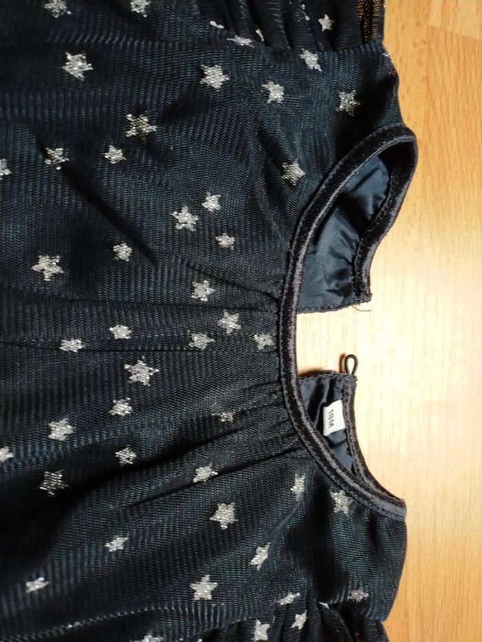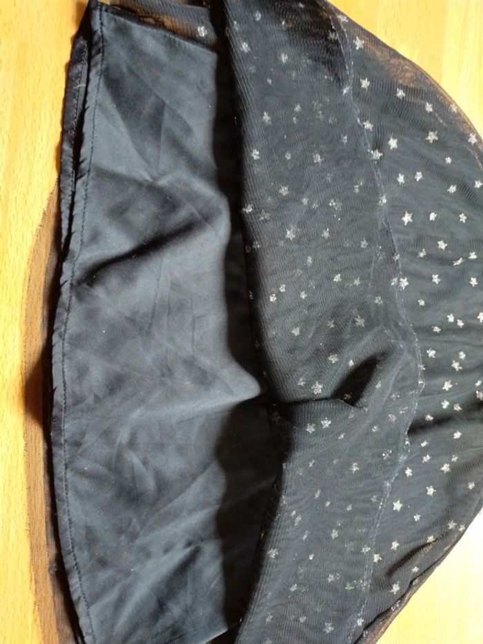 Robe noire en tulle doublé avec des étoiles en paillette. Petits mancherons. Très jolie et très habillée