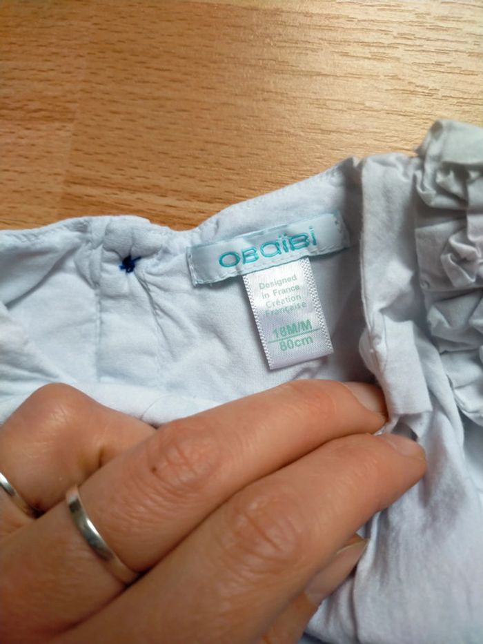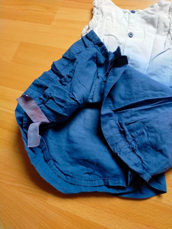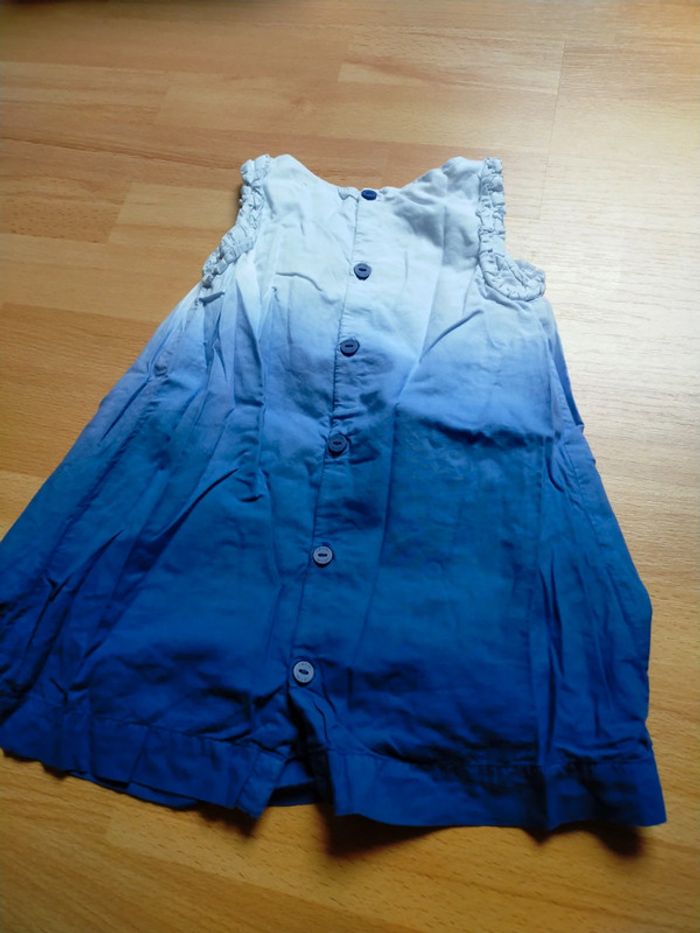 Robe dégradé de bleu. Petits mancherons. Entièrement boutonnée au dos. Doublée
