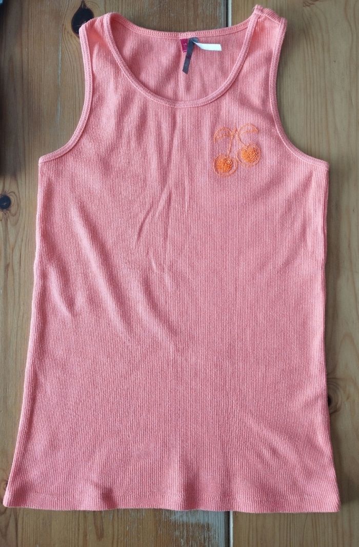Vends débardeur côtelé Pas visible sur la photo mais il est plutôt orange fluo Avec une paire de cerises brodées 🍒