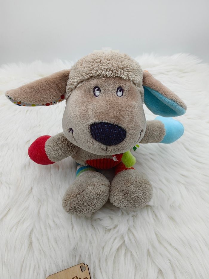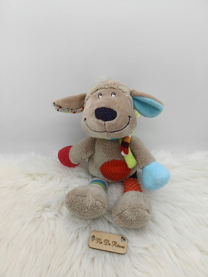 Doudou Mouton ou Chien Nicotoy gris/beige, ventre rouge, étiquettes - photo numéro 1