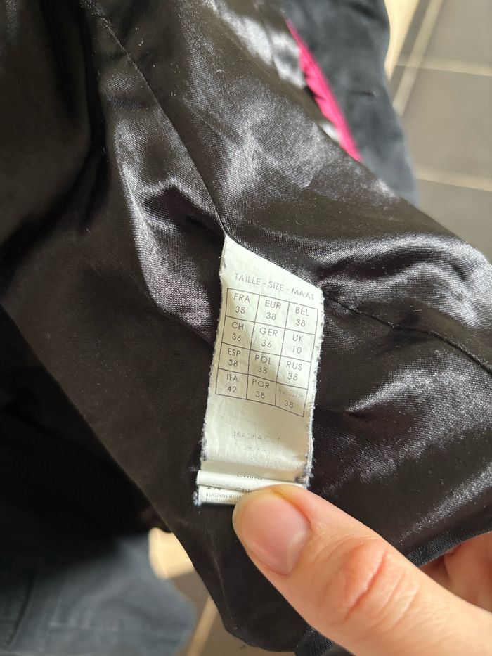 Veste style tailleur Matière : synthétique Taille : M / 38 mais taille S (je suis serrée à la poitrine) Marque : Mim Léger accro au col à l’intérieur #tiffanie4439_femme