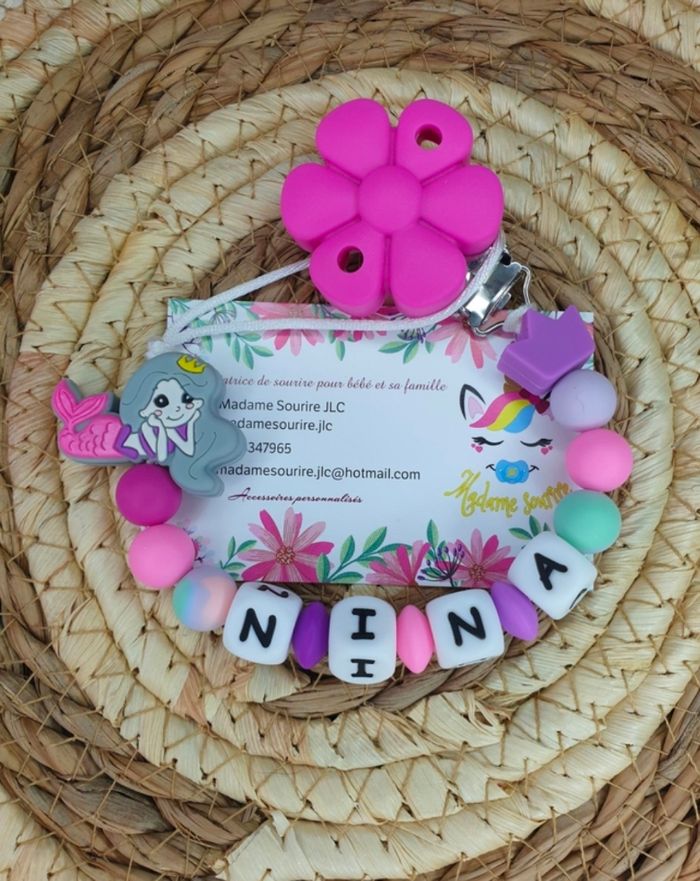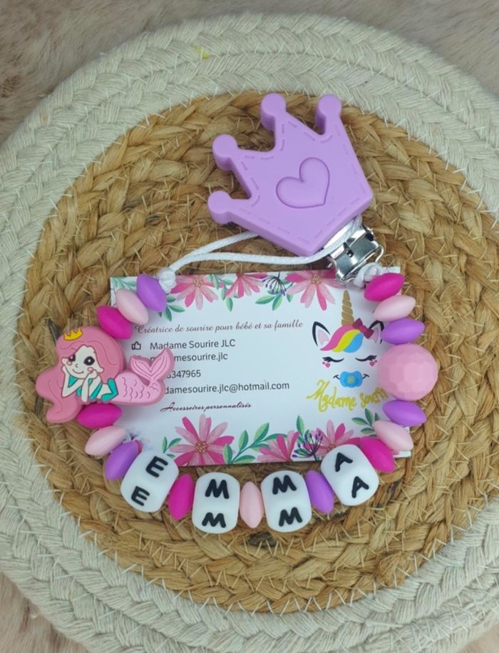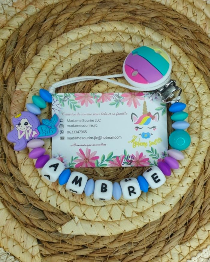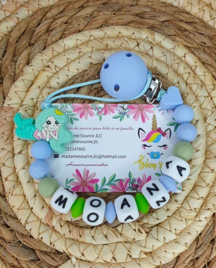 Une Attache tétine Sirène pour ne plus perdre la tétine avec une boucle pour attacher celle-ci (adaptateur MAM disponible pour les tétines MAM dans les accessoires) et un clip pour accrocher l'attache à un tissu sans l'abîmer. Respect des normes CE, composée de perles silicone alimentaire et/ou bois naturel. 100% personnalisable, énormément de choix de clips, perles, etc… Envoyez-moi un message afin de créer main dans la main votre accessoire idéal.