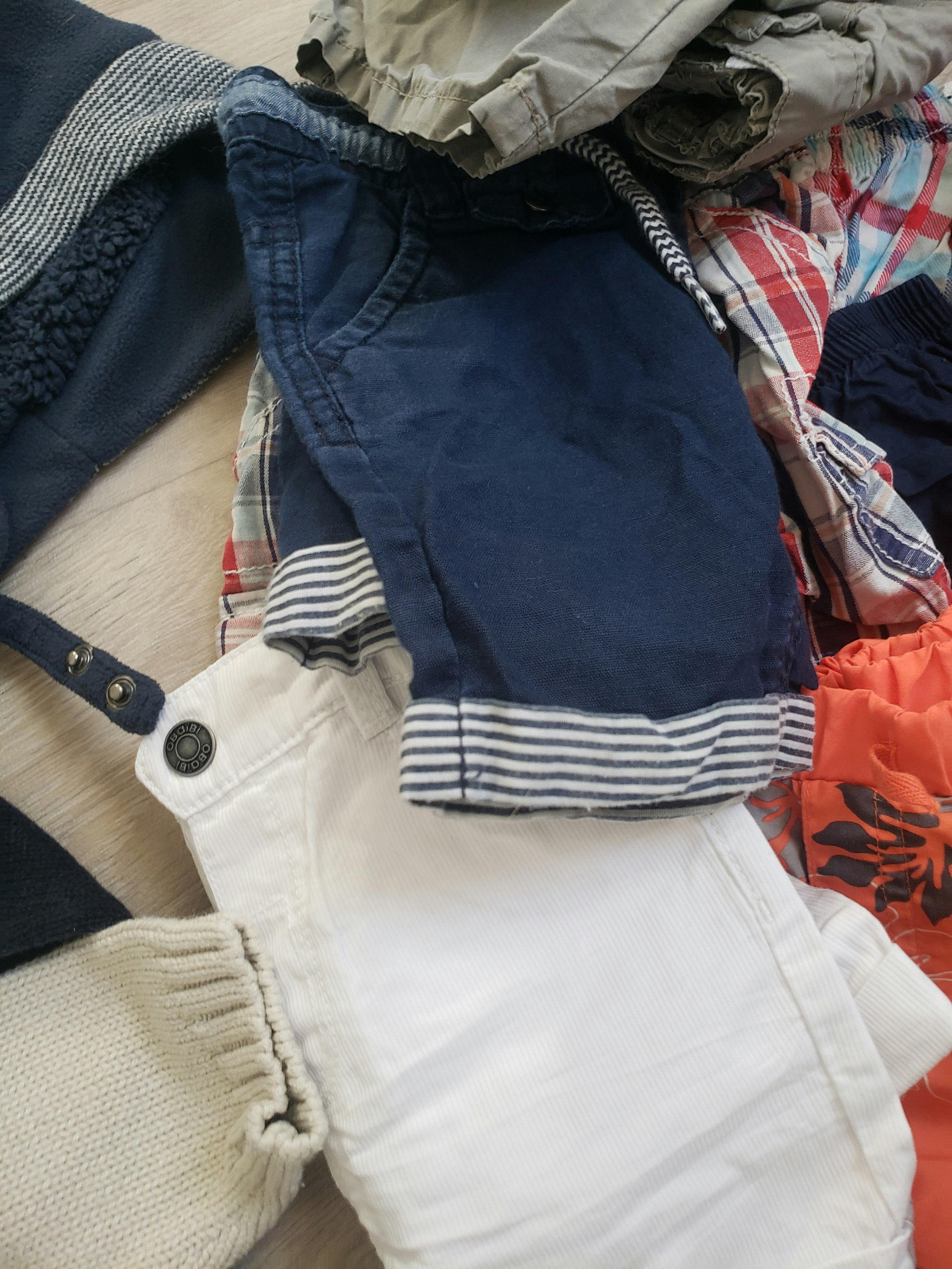 Vend grand lot 18 mois garçon comprenant : 1€pieces 14 pantalons 4 t-shirt manche longue 1 polo manche courte 1pull 1 gilet 1 bonnet okaidi 8 short Beaucoup de marque okaidi et sergent major, creek....
