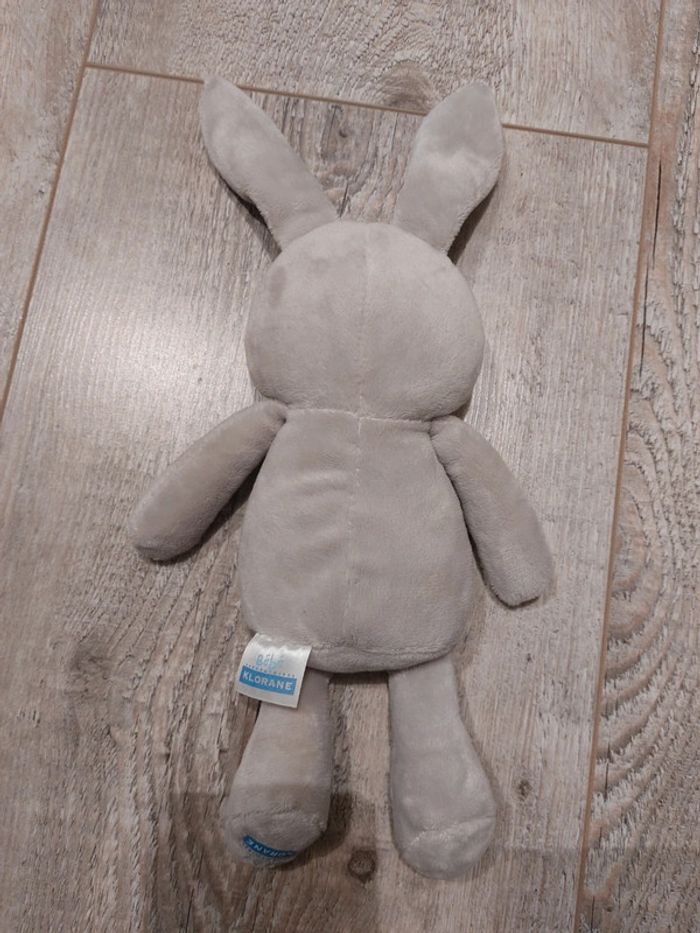 Peluche lapin tout mimi pour bébé. Grise et bleu. Marque Klorane. En bon état