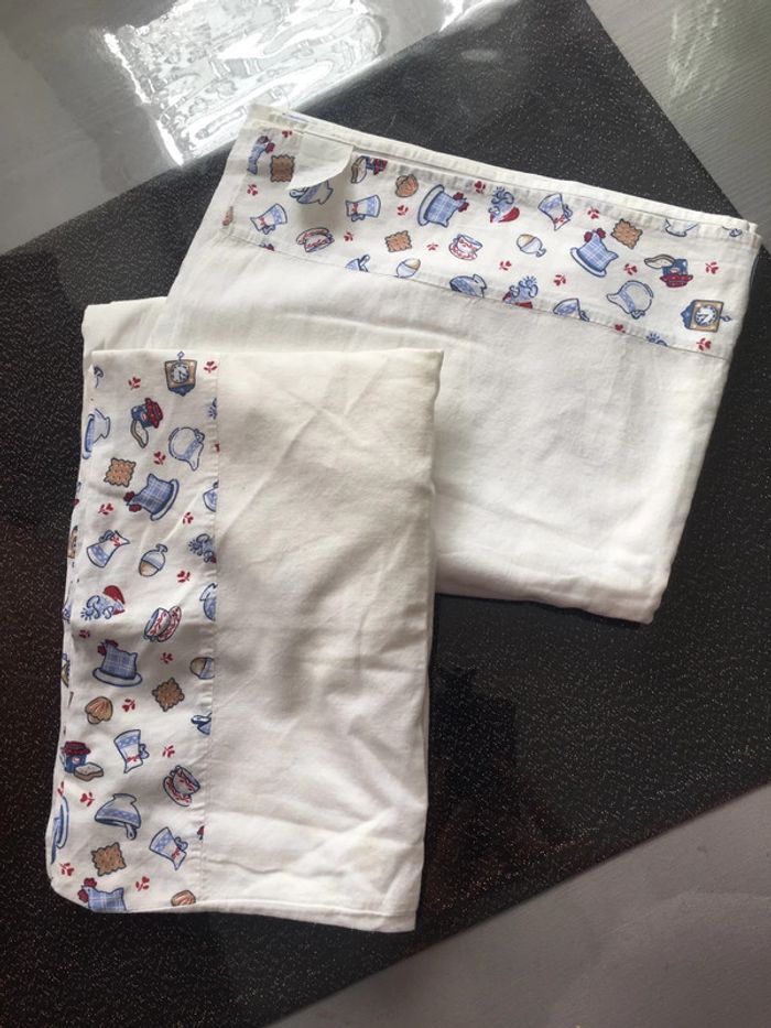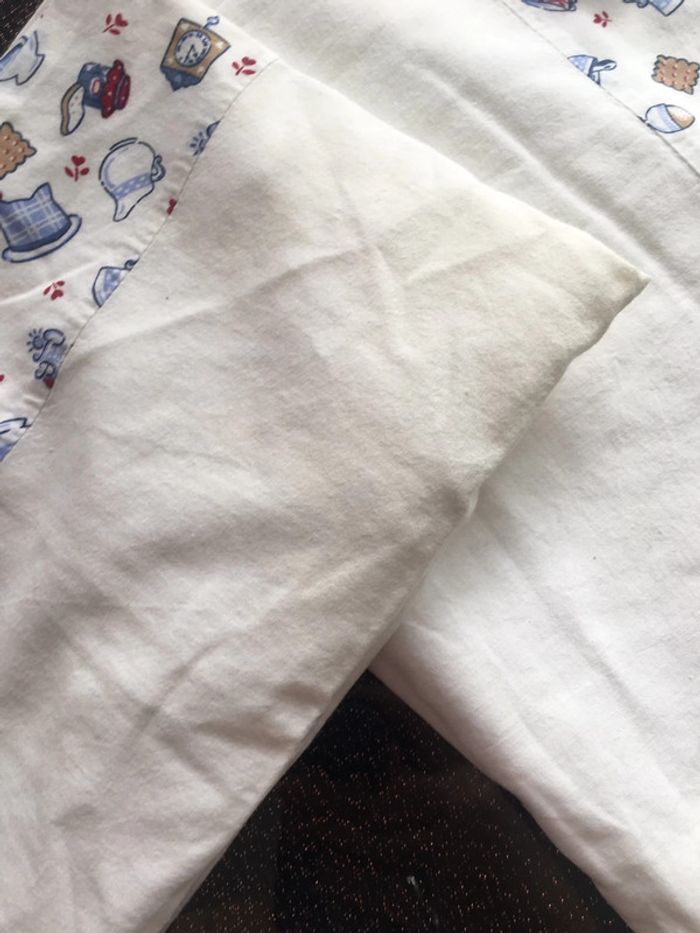 drap lit bébé barreau avec taie d’oreillers un peu jauni avec le temps #drapbebe #petitetache #lingedelit