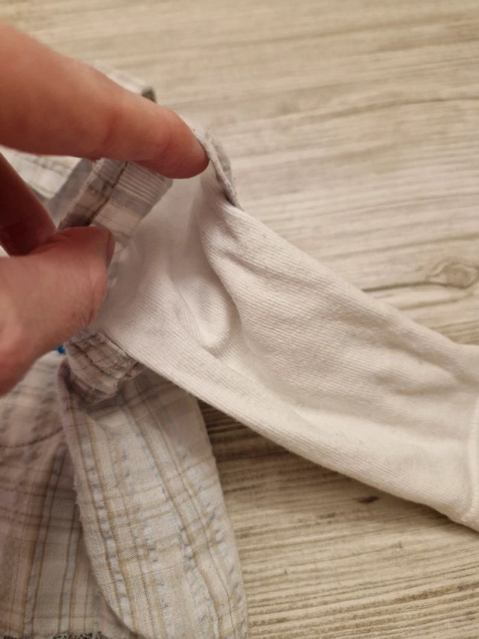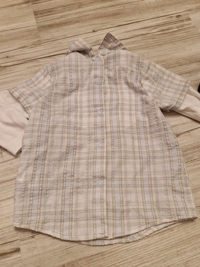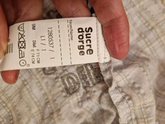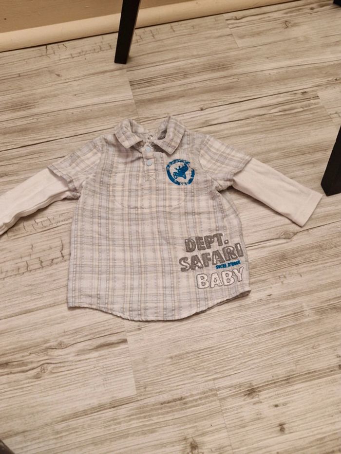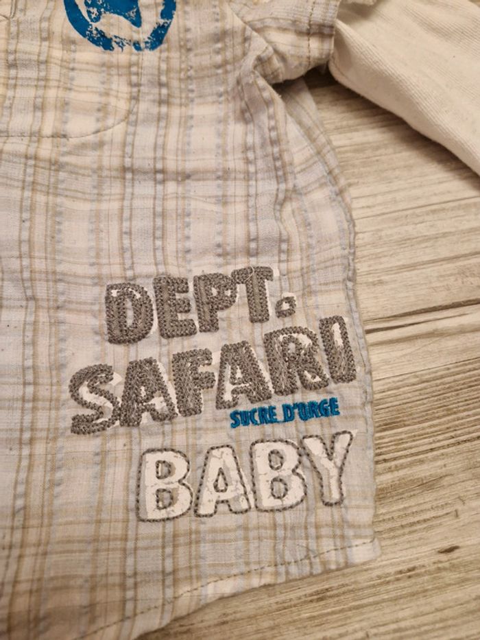 Chemise en 9 mois s'attache dans le dos par pression. Parfait état uniquement le logo lui s'efface un peut
