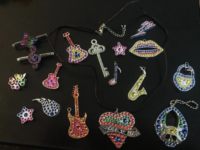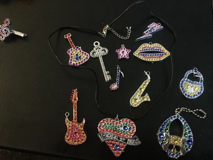 un collier avec plusieurs pendentifs un porte clé 2 barrettes avec clips interchangeables