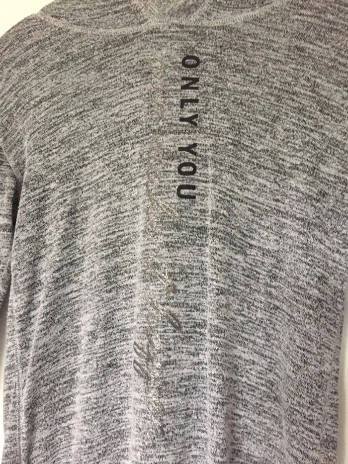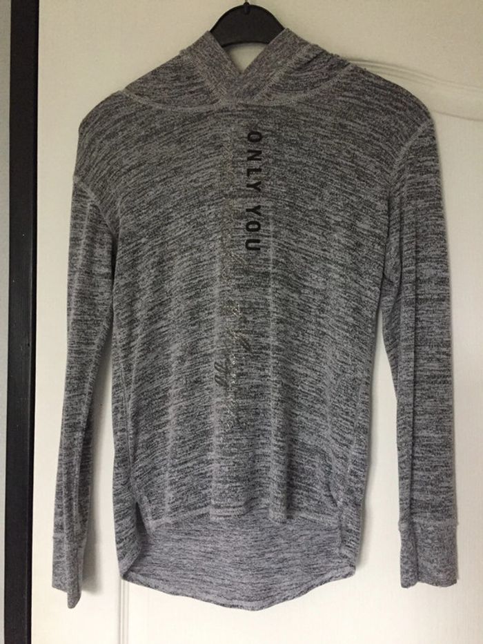 pull fin avec écriture noir et argentée capuche 11/12 ans