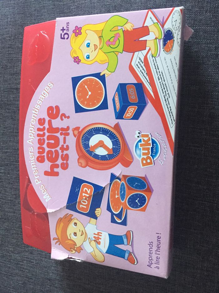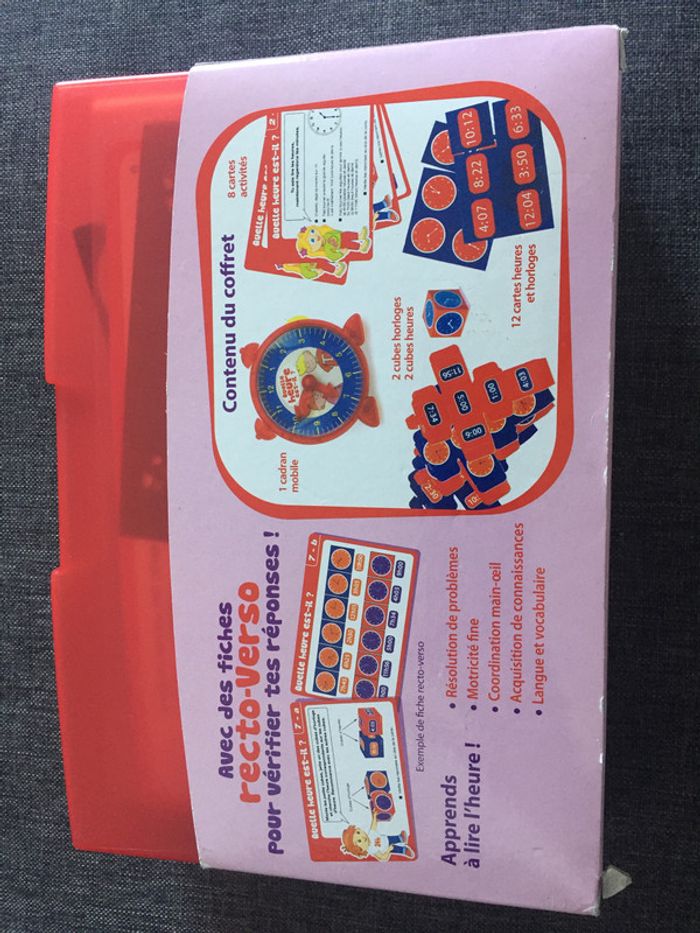avec des fiches recto-verso Contenu du coffret : -1 cadran mobile - 8 cartes activités - 2 cubes horloge, 2 cubes heures - 12 cartes heures et horloges.
