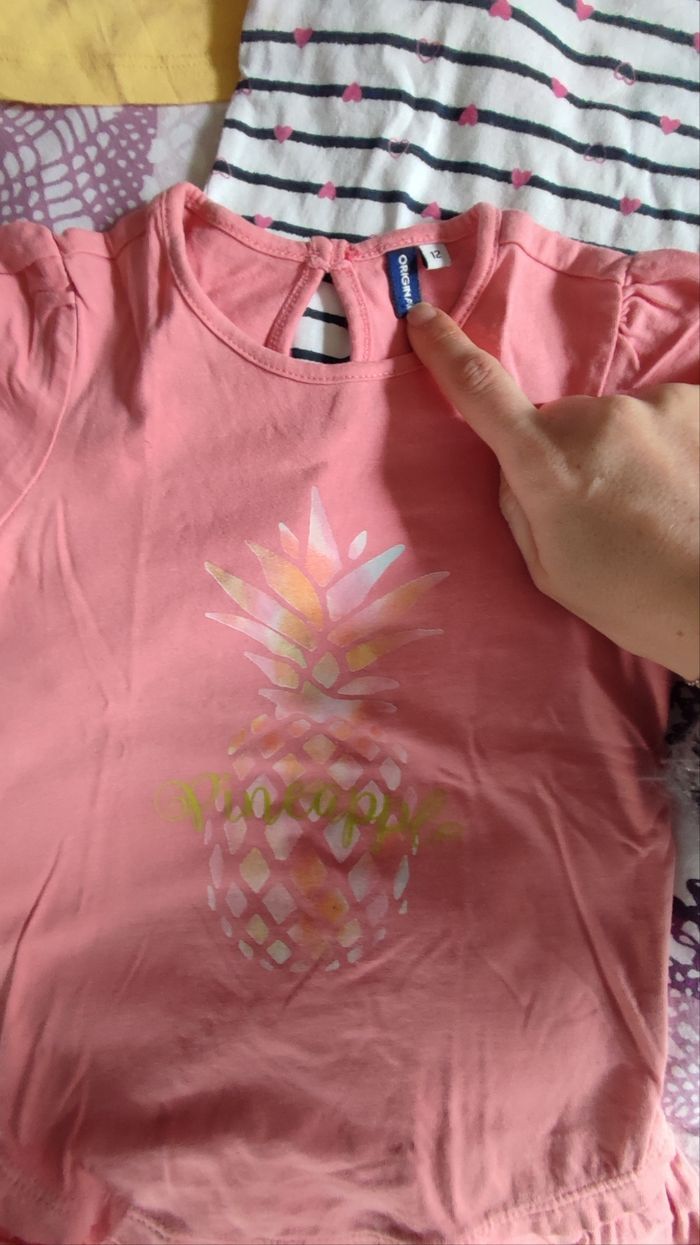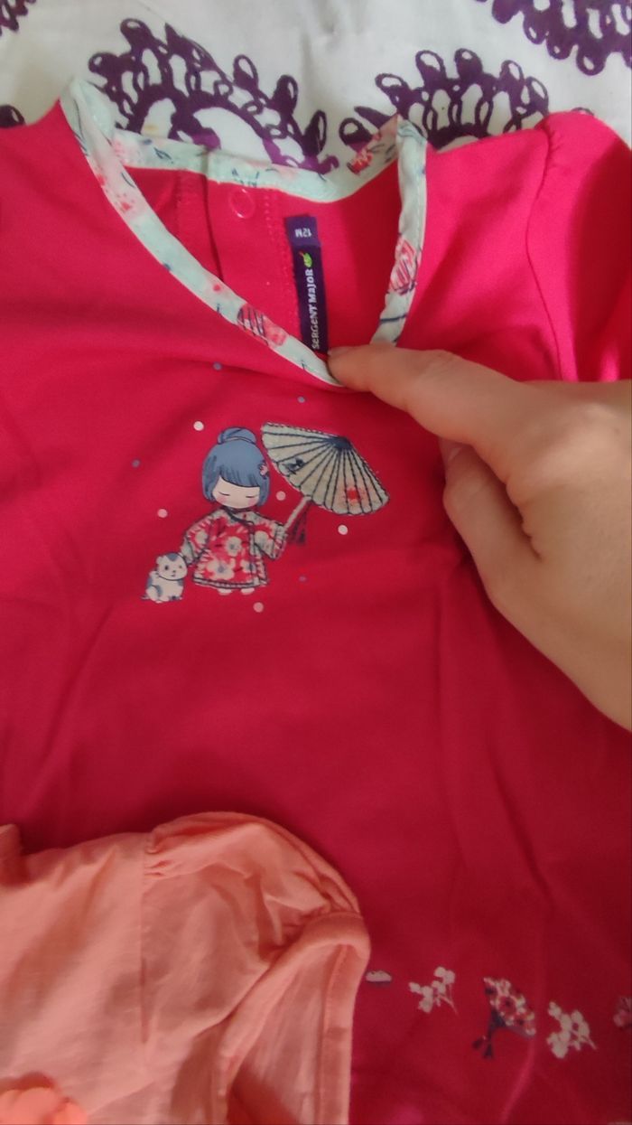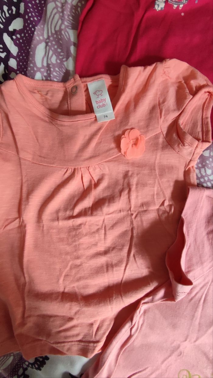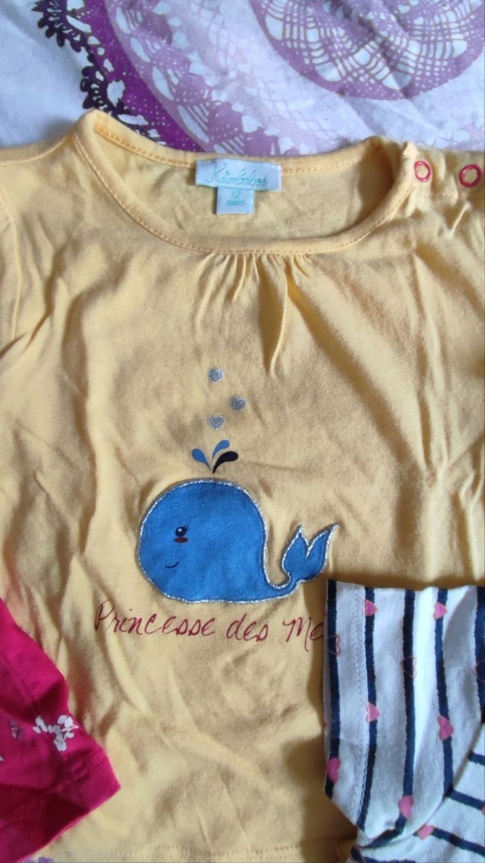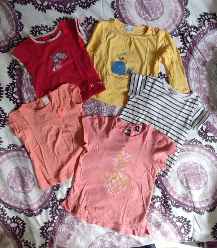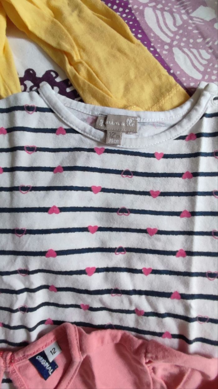 Lot de plusieurs tee-shirts manches courtes et u n tee-shirt manches longues: - un tee-shirt manches longues de chez Kimbaloo. - un tee-shirt manches courtes à rayures et avec des petits cœurs de chez Grain de blé. -un tee-shirt manches courtes rouge avec petite japonaise de chez Sergent major. -un tee-shirt manches courtes rose clair avec petite fleur de chez C&A. -un tee-shirt manches courtes rose clair avec una nanas dessus de chez Origin Marines. Tailles 12M. Très bon état général.