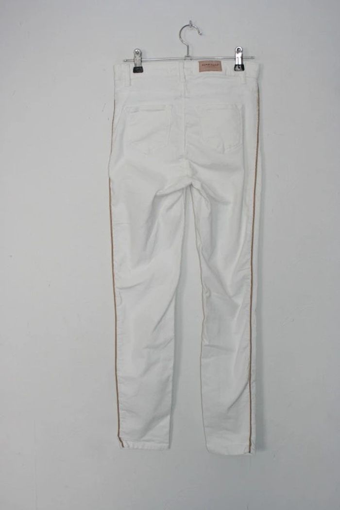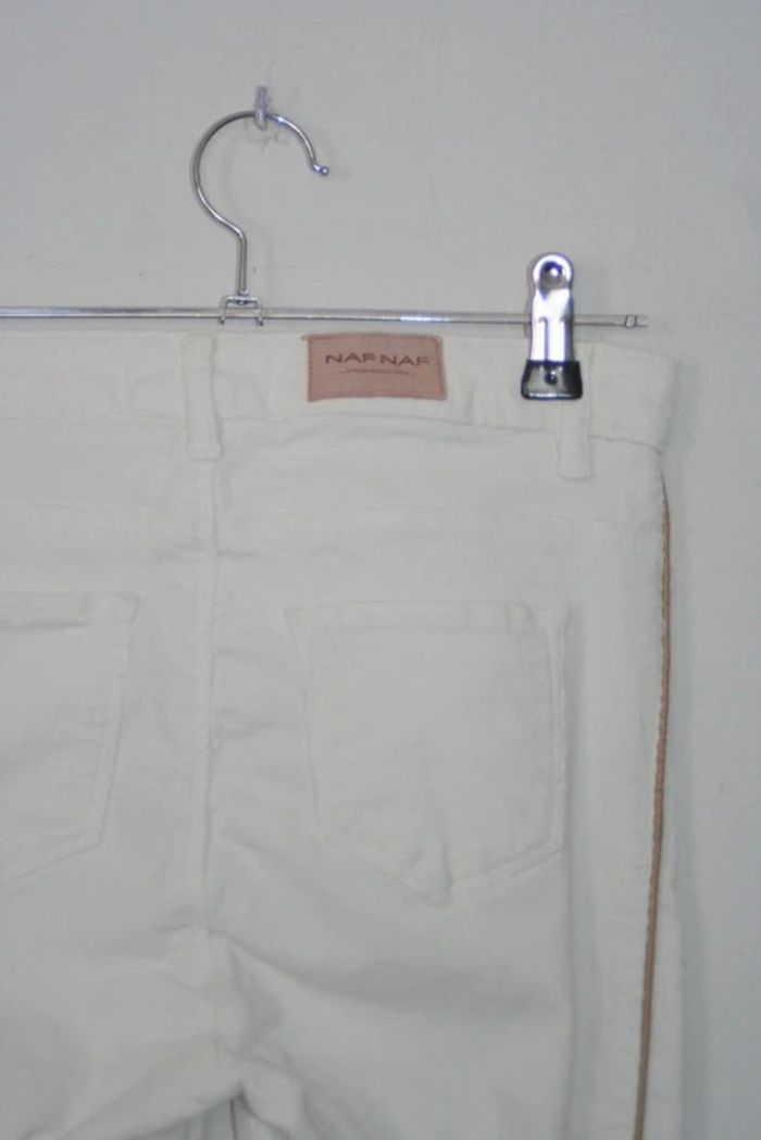 Pantalon velours fines côtes couleur crème avec fine ligne marron sur le côté, de chez NafNaf, taille 34, léger défaut dans le stretch à l'entrejambe, 97% coton / 3 % élasthanne, 32cm à la taille et 91cm de long, 350g
