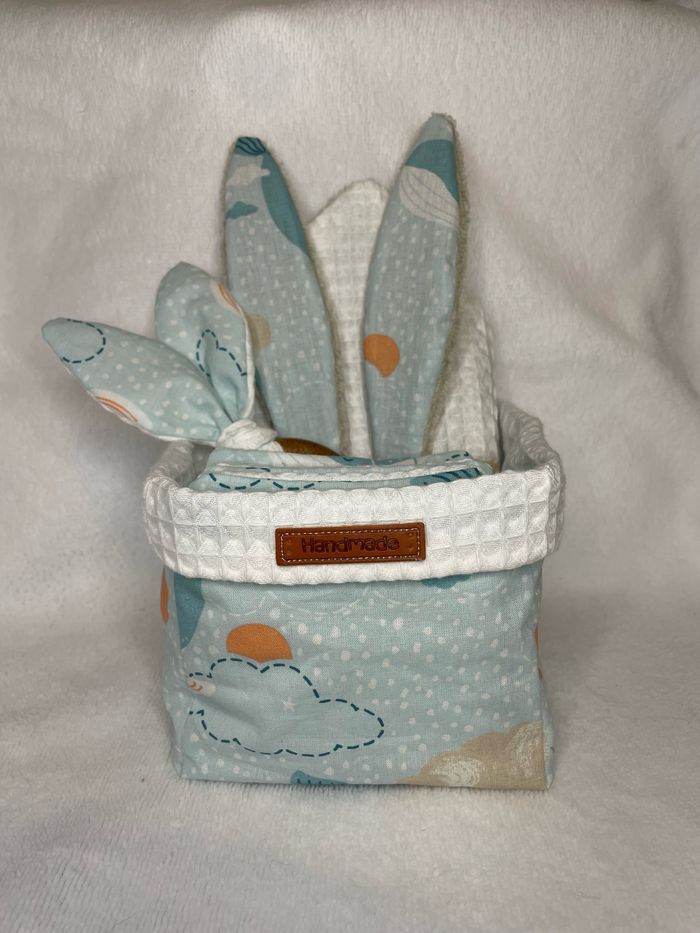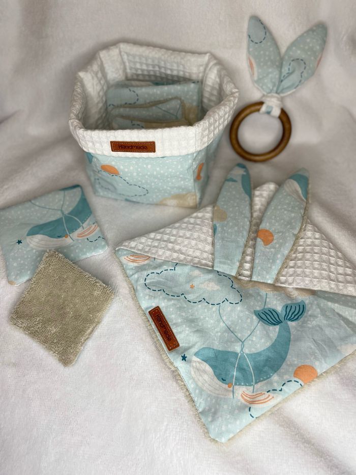 Panier bébé fait main : Motif: Baleine • Un panier de rangement • 8 lingettes (4 grandes, 4 petites) • Un doudou plat • Un hochet Matière : -Nid d’abeille -Coton -Bambou