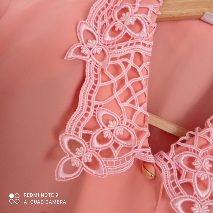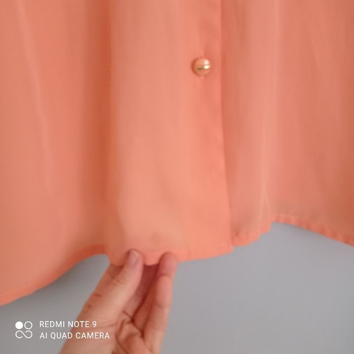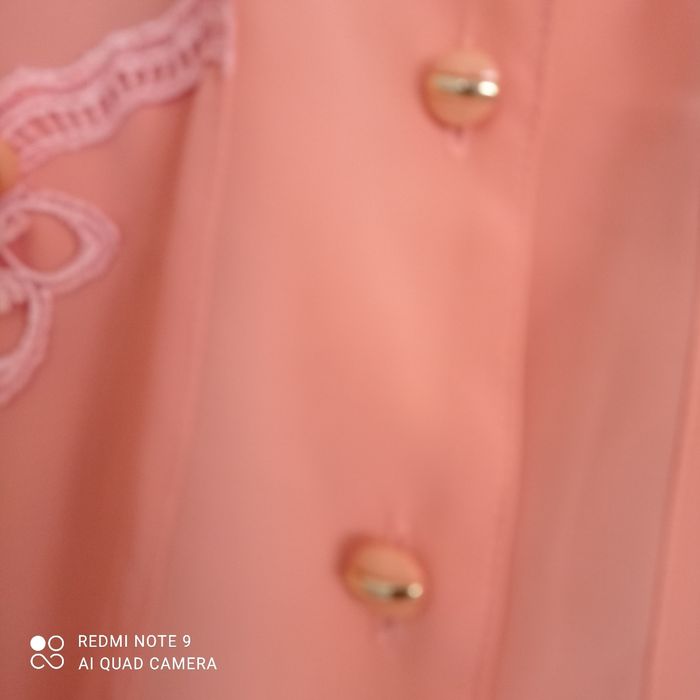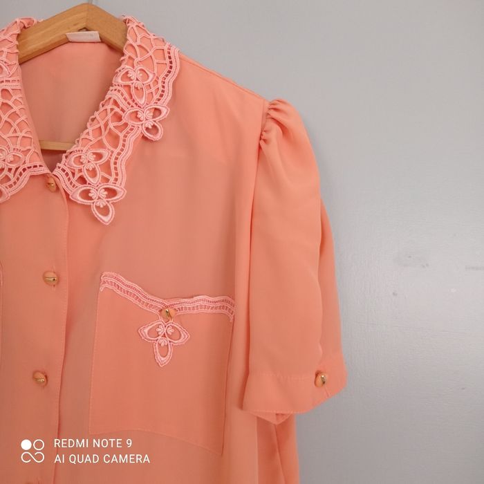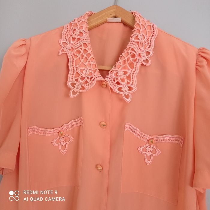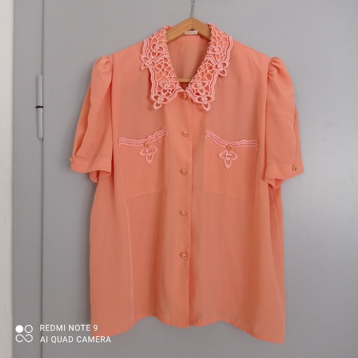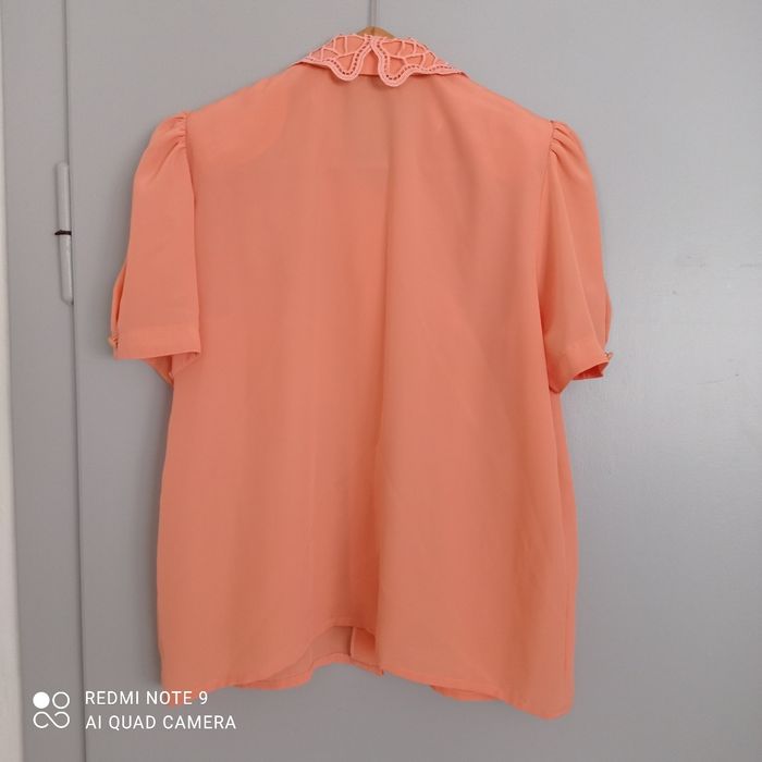 Col ajouré. Et poches. Jolis boutons. Une petite tache voir photos. Qui ne se voit pas si on fait rentrer la blouse dans le pantalon. Taille estimée. Mesures sur demande. C15