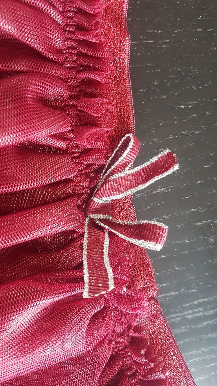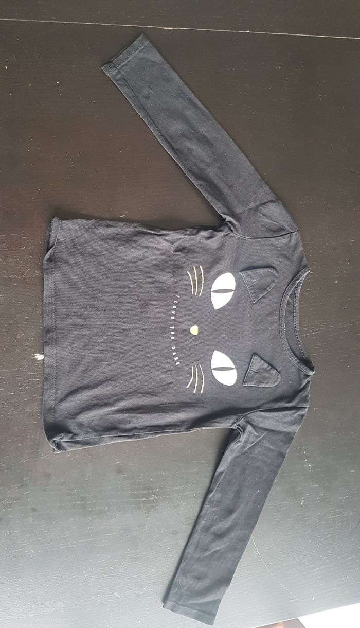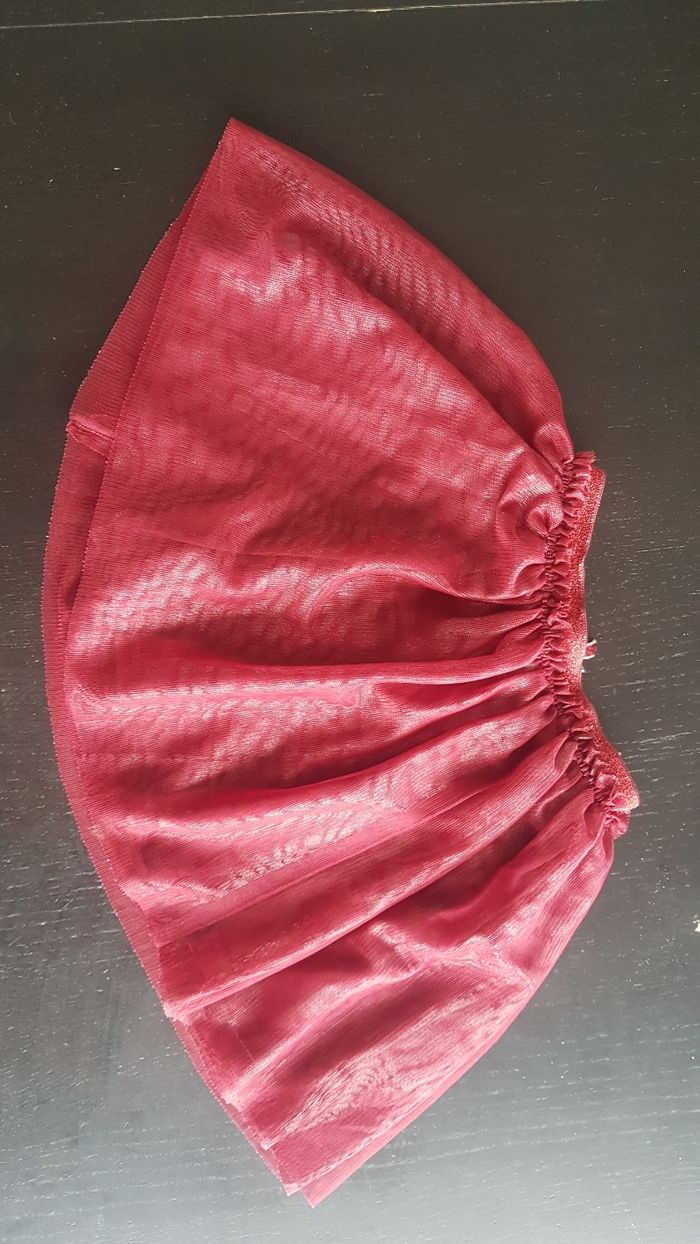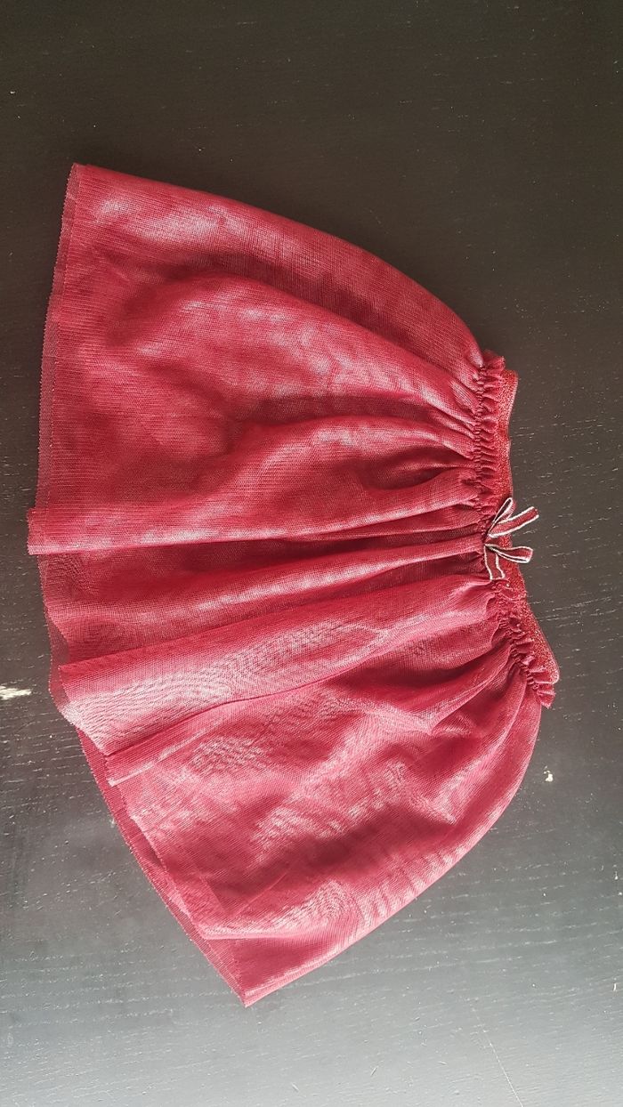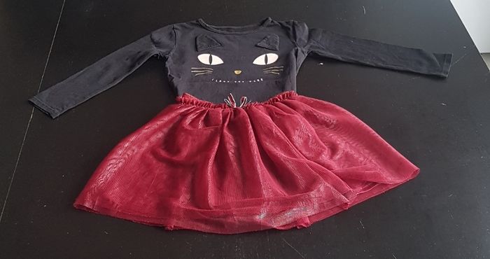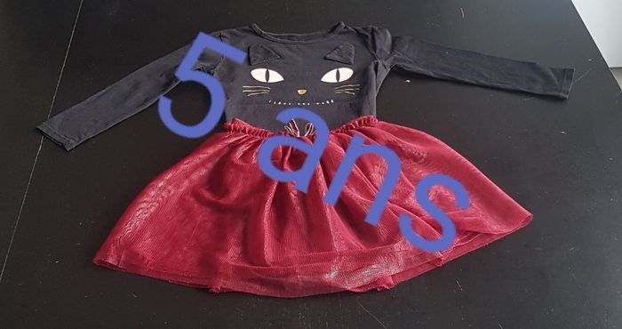 Composé de : une jupe patineuse en voilage bordeaux, ceinture élastiquée avec petit noeud rouge et argenté. La jupe est doublée. Un tee shirt manches longues noir avec petit dessin chat doré et oreilles dessus. Marque Kiabi pour la jupe. Marque Gemo pour le tee shirt. Taille 5 ans. En excellent état.