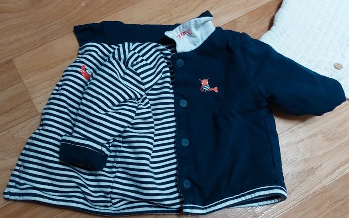 Lot de 3 vestes en taille 6 mois La blanche est une vertbaudet Veste réversible mariniere /marine sergent major Veste avec capuche dinosaure sergent major ( la fermeture éclair ne se ferme qu'à la moitié. )