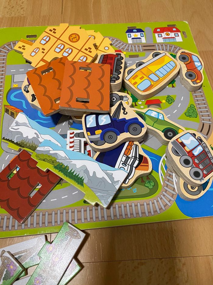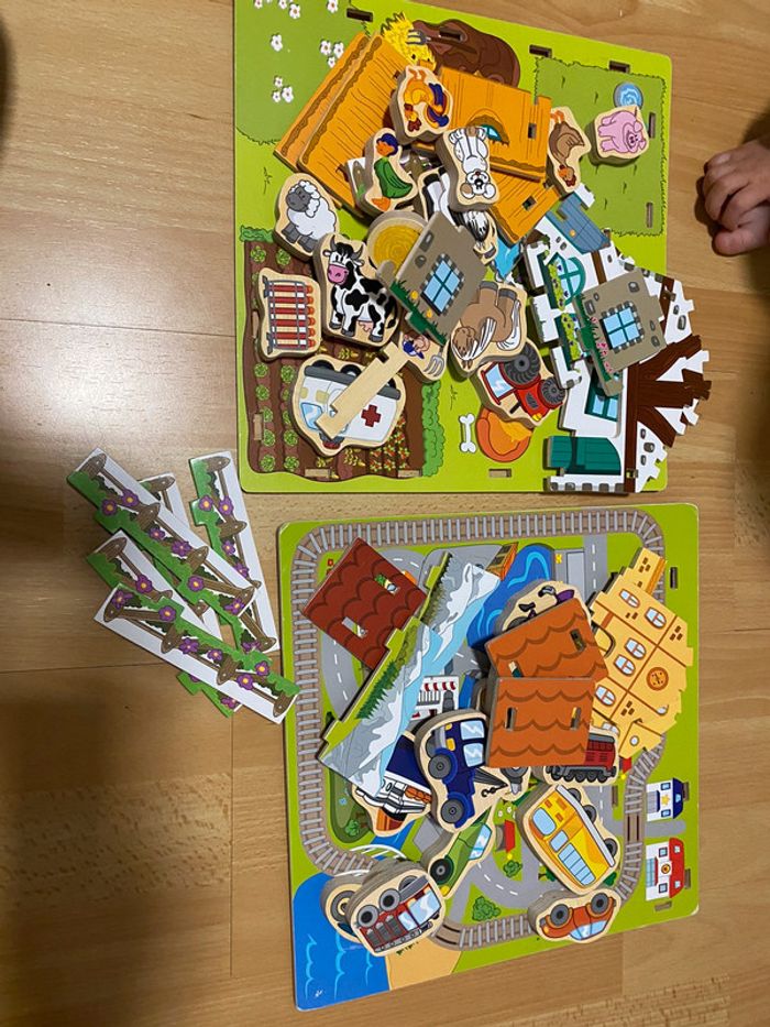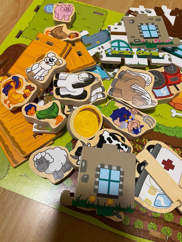 Jouet en bois, la ferme et la ville , manque deux trois pièce (barrières ou autre) mais ne gêne en rien l’utilisation.